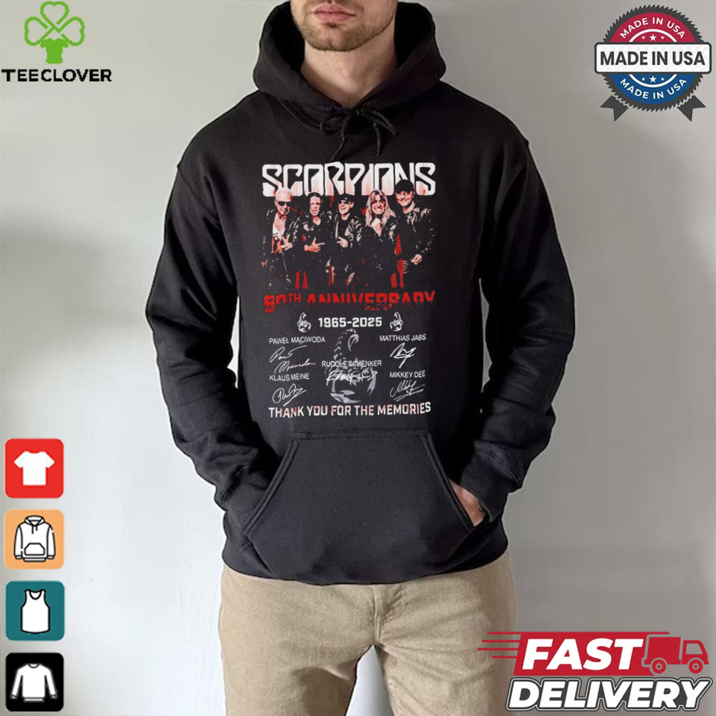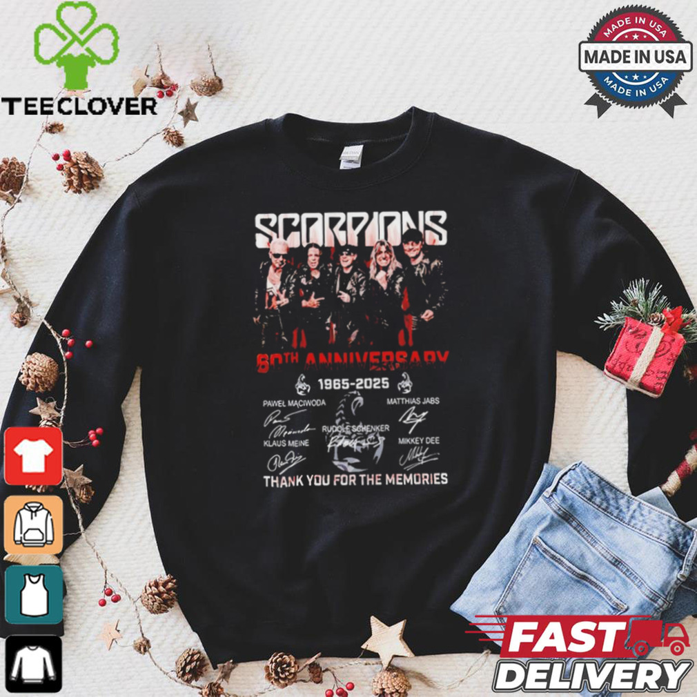 The radio station put out a call for help. We found a Official Scorpions Coming 60th Anniversary 1965 2025 Thank You For The Memories T Shirt, someones front yard, they were going to give them away, but notify the media so everyone would know about it. I made all of the connections, but the truckers were not familiar with that sections of town, so I told them to follow me. It was still raining I had to drive slowly. This was crazy, I was taking a huge truck of Christmas trees to someones home that I did not know. It was around midnight by the time we took off looking for the place. We arrive and the owner of the house had organized the entire neighborhood into helping. Someone made hot chocolate and coffee. Some on had baked some brownies, someone had got several of the neighbors to start contacting all of the media, someone rolled a bunch of joints. Everyone was in a good mood. There were several thousand trees. We left around 3 AM, got a little sleep, and was back there at 8 AM. What a zoo. There were hundreds of people coming to get their free Christmas trees. The newspaper, radio and TV stations were there covering the free Christmas trees. This went on all day and there were still lots of trees left. We returned the next day, there were even bigger crowds. The media was there again. It was a good Christmas feel good story.