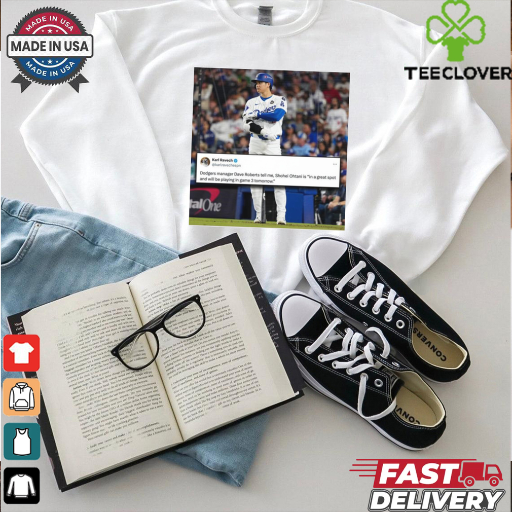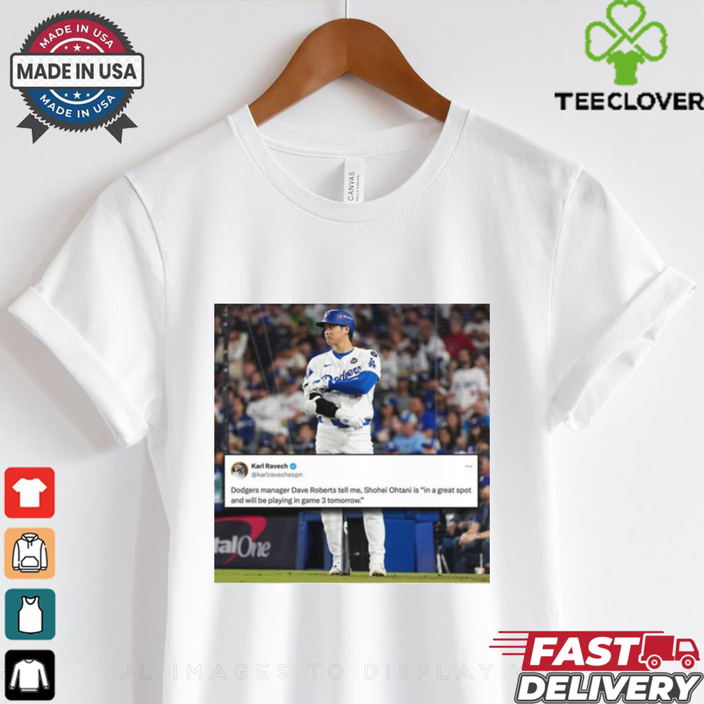 Something that helps is to wear an Official Shohei Ohtani is expected to play World Series Game 3 Dave Roberts tells ESPN Poster t shirt under your tshirt. This helps hide your bra if you wear one, and puts some distance between you and your shirt, making the shapes less pronounced. It also is a godsend if you want to wear a button shirt but itβs too hot to have a tshirt underneath, or if you need to take off your shirt in public for some reason, like if you spill coffee on yourself, or you miscalculated the temperature, or you need to do some heavy lifting and get sweaty. Theyβre also very masculine, so if someone spots the one you have on, it reaffirms your gender expression.