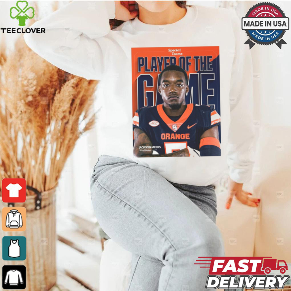 The Official Special Teams Syracuse Orange Players Of The Game Jackson Meeks Poster t shirt is educational in nature and also includes holiday items from the other world religions such that the large majority of humanity (66-90%) are covered including purely secular displays. The displays would include educational material created by a diverse and multicultural team of experts and educators. This would be acceptable in museums and schools. A display that does not focus on Christianity but also includes secular and other world religions decorations as would be appropriate for the season. The displays should not be intrusive and should be ornamental in nature. A description or plaque explaining the religions represented should be placed nearby.