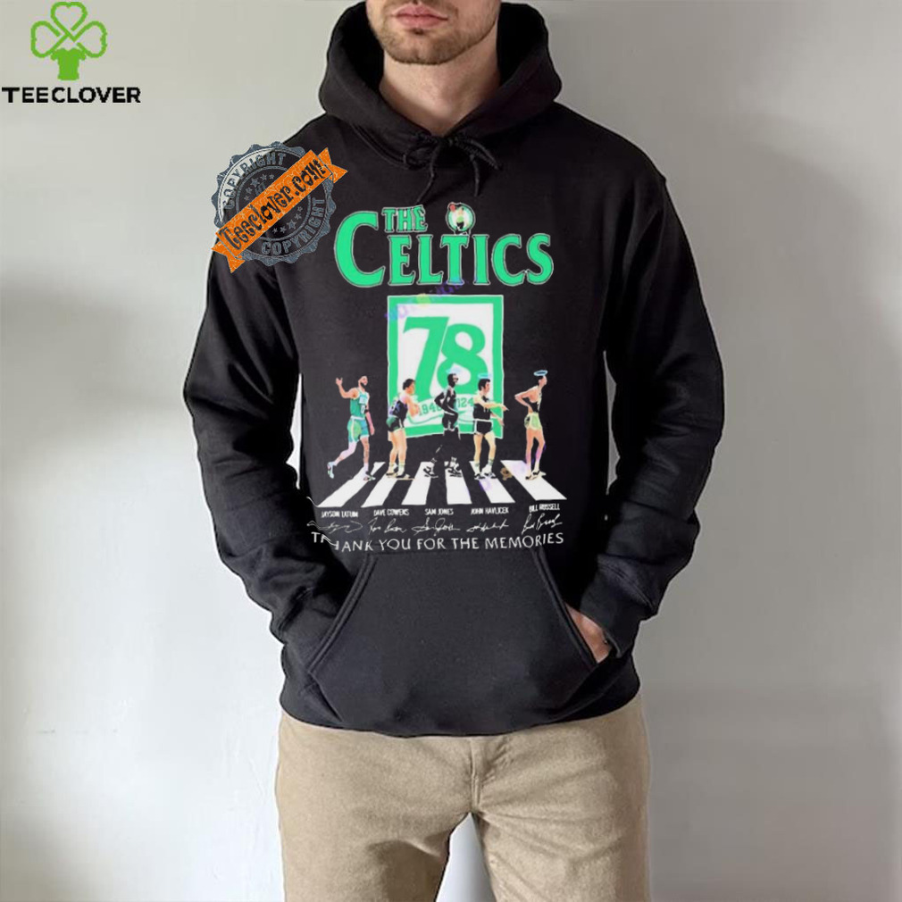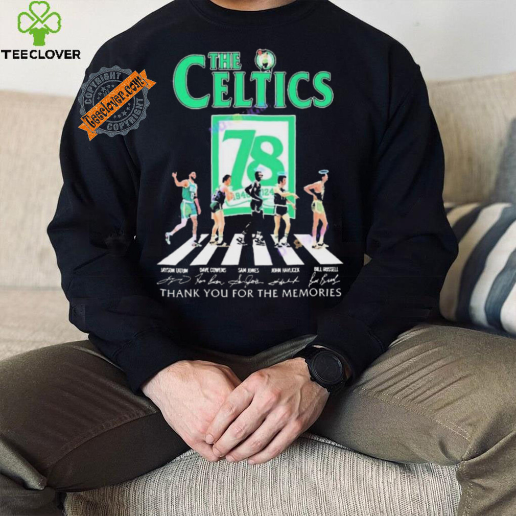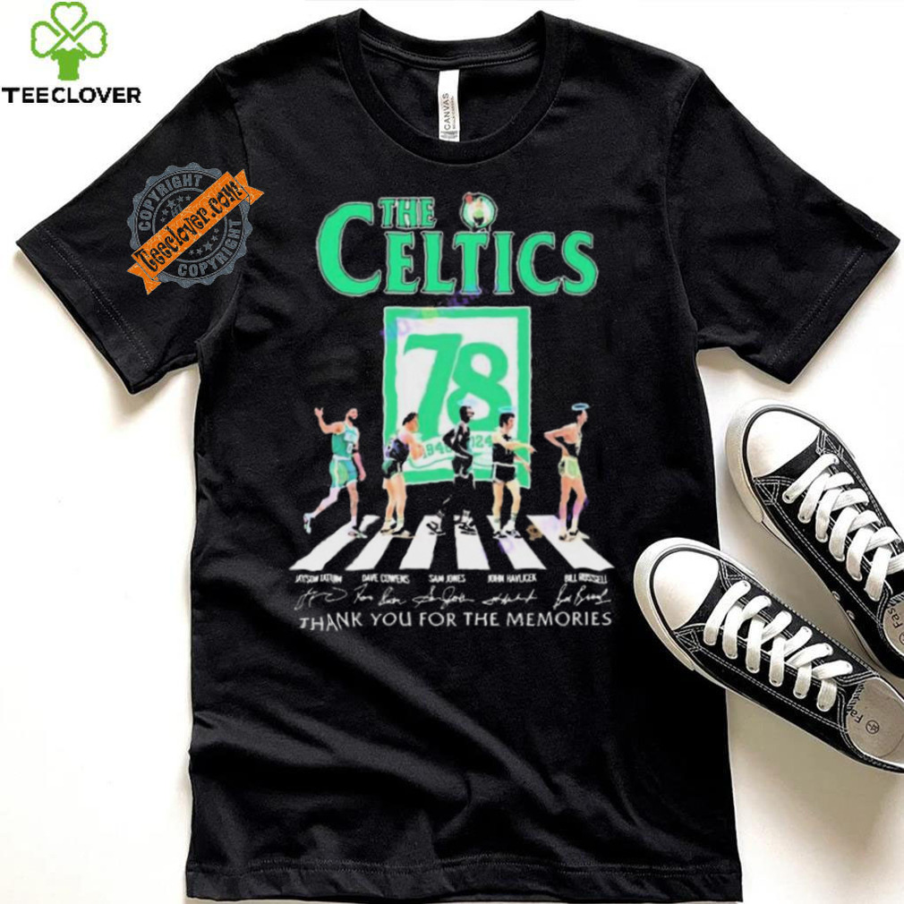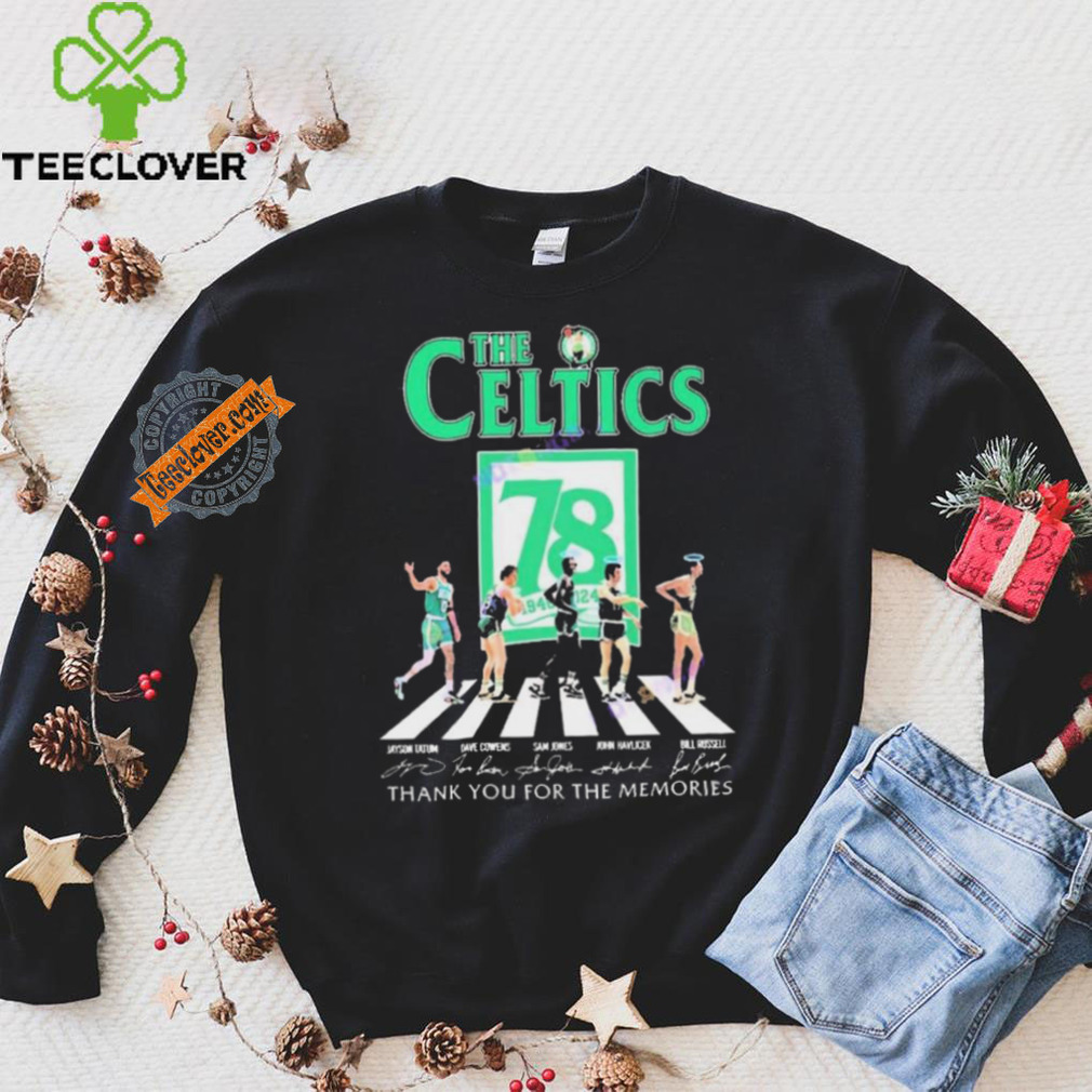 I do not remember Christmas Day itself that year, but the events around theOfficial The Boston Celtics 78 Years Signatures Thank You For The Memories shirt this holiday changed my life forever. I was living in Los Angles at the time and was dirt poor as I was very underemployed. I did not have any ambition, but was content. I had a new girl friend (we had been dating for not yet six weeks). I was too poor to buy a Christmas tree. It had been raining for about a week, and was expected to raining for the next week (for those of you that do not know the weather for Los Angeles, this was highly unusual). Three days before Christmas I was driving around with my girlfriend doing some last minute Christmas shopping, when an announcement came on the radio that they were giving away free Christmas trees at a location about one half mile from where we were. I looked at my girlfriend and she said, “Yes, let’s go get a Christmas tree” A couple left turns later, there we were. There was a truck with two trailers full of Christmas trees trying to give them away. The owner of the property where the truck was park had call the police and wanted them to be charged with trespassing. He had Christmas tree lot down the street and this was killing his business.