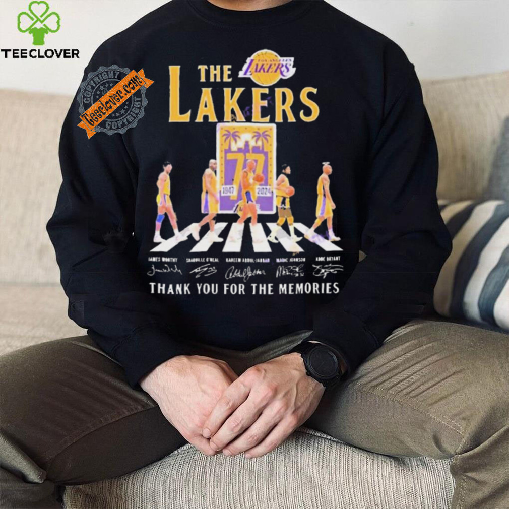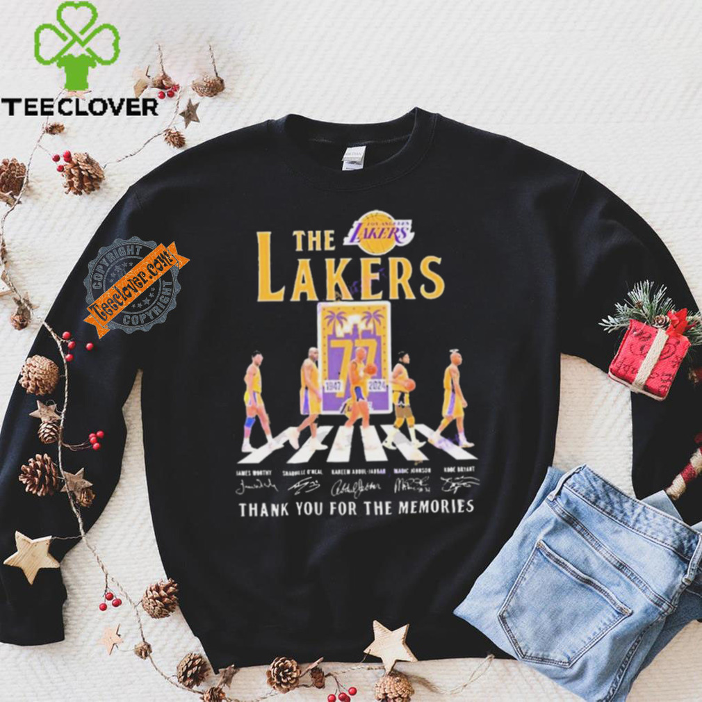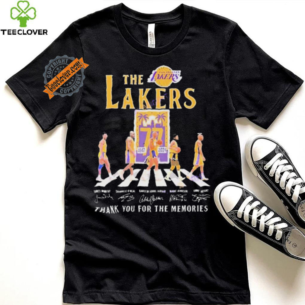 My grandfather was fond of Official The Los Angeles Lakers 77 Years 1947 2024 Signatures Thank You For The Memories shirt. When diabetes affected his legs and made him immobile, he continued to whistle. When glaucoma affected his eyes and he lost his eyesight, he continued to whistle. As someone in her early 20s, I found my granddad’s immense pleasure from life overwhelming and infectious. Here was a person who was losing all his senses, yet was gracious enough to utilize and maximize his happiness from the senses he still retained. Try whistling. It improves your lung capacity and will send more oxygen into your bloodstream, making you feel better instantly.Try cooking. I hear it is quite therapeutic when used to counter depression. Try duck meat (if you eat non-veg). If you have trouble sleeping, I read that tryptophan (an amino acid in duck meat) puts you to sleep instantly. Alternatives: try honey with milk before sleeping.