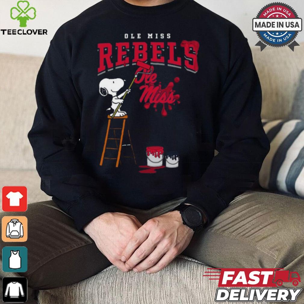 It’s a Ole Miss Rebels Snoopy Painting Shirt kid’s movie that adults can enjoy. The only bad language is done in a cutesy way, with unintelligible sounds, kind of like the adults always talked in Peanuts cartoons. Ralph gets his mouth washed out with soap for it. The only violence is a scene where Ralph, while being picked on by a bully, snaps and fights back. It isn’t overly violent, and it isn’t glorified fighting, it’s just a couple of kids fighting in the snow like kids do. Ralph is crying throughout, so it is not some kind of ‘Aha, the victim has turned the tables with violence!’ I think the only other scene of violence is where Ralph fantasizes that he defends the house from burglars in the backyard with a BB gun. The scene is in black and white and sped up like a funny silent movie, and the burglars wear comical, old timey burglar outfits – striped shirt and black masks, like the Hamburglar. I think Ralphie shoots them in the butt as they try to climb back over the fence to get away.