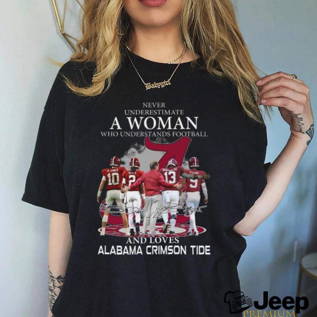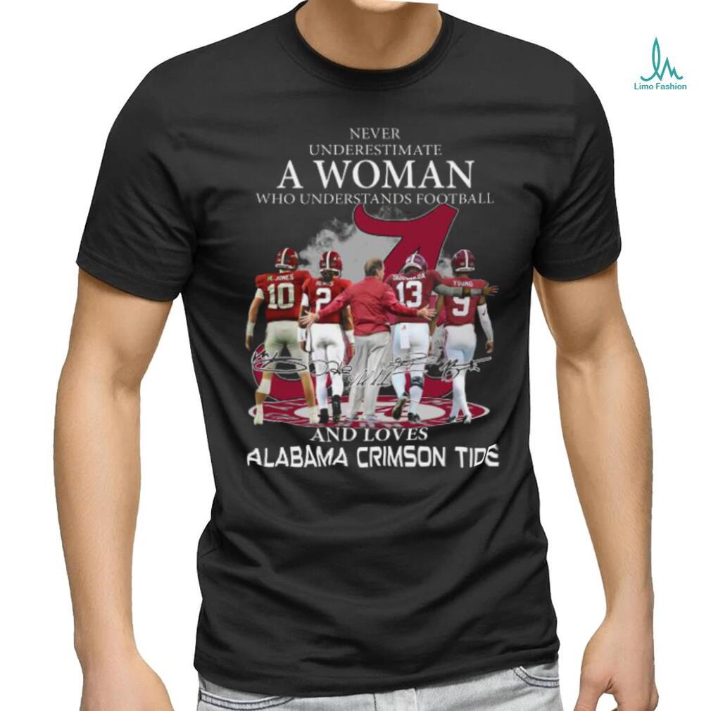 ()Original Never Underestimate A Woman Who Understands Football And Loves Alabama Crimson Tide Team Players Signatures T Shirt, Hoodie, Sweater, Vneck, Unisex and T-shirt