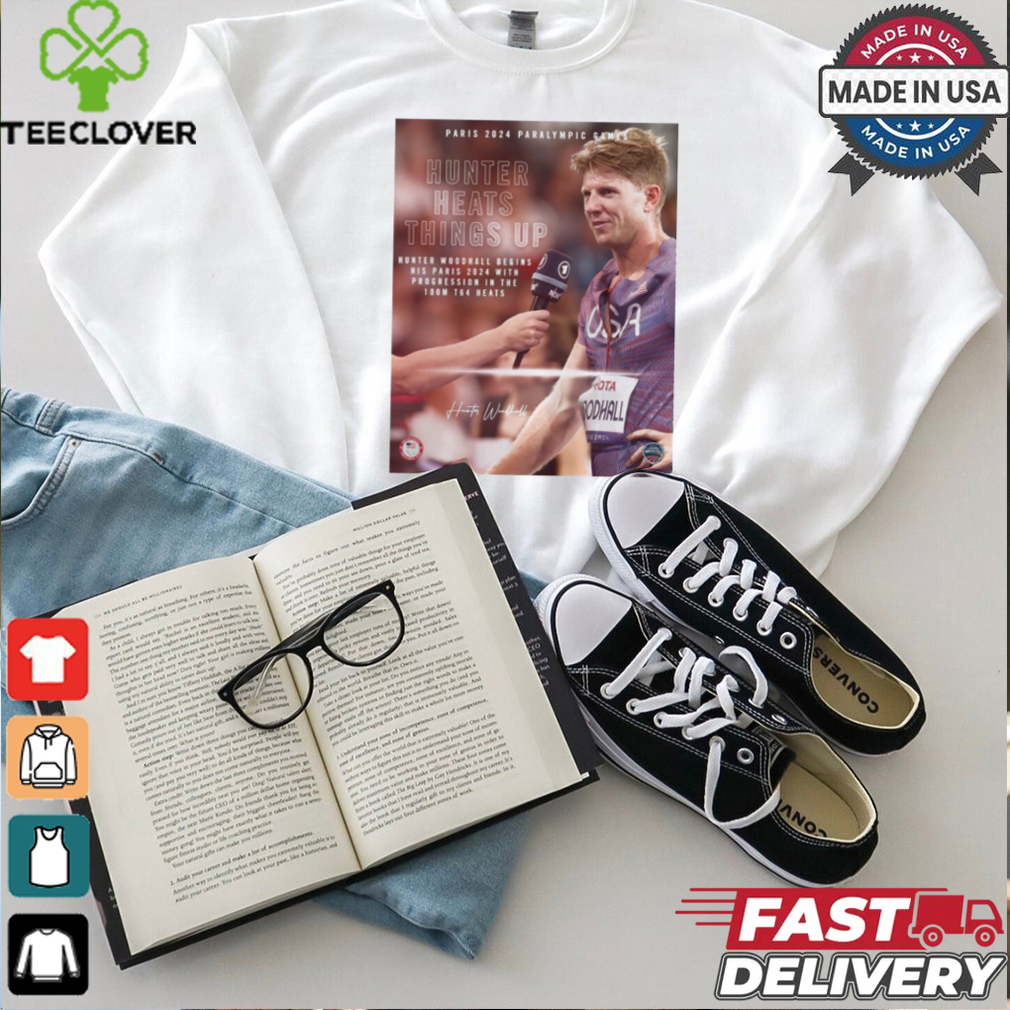 I definitely needed to pour the water out of my Paris Paralympics 2024 Poster Hunter Woodhall Heats Things Up Signature t shirt , they were so wet that it seemed that I was standing with my feet just in the water. My sneakers squelched frantically as I made my way to the bench. I also twisted out my socks and straightened the cuffs on the legs here.My family has been waiting all this time, and as soon as I finished we were on our way. The feeling of wet clothes fascinated me so much that I did not notice how we made our way back.