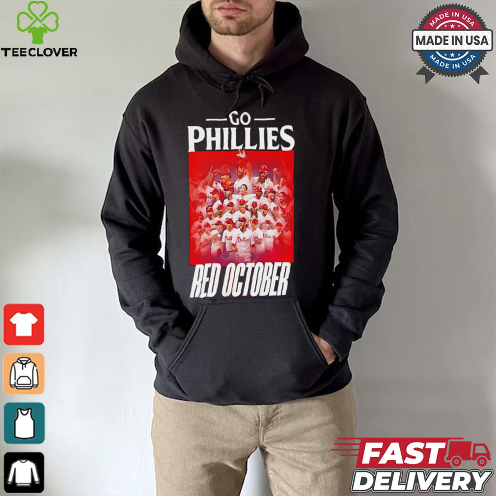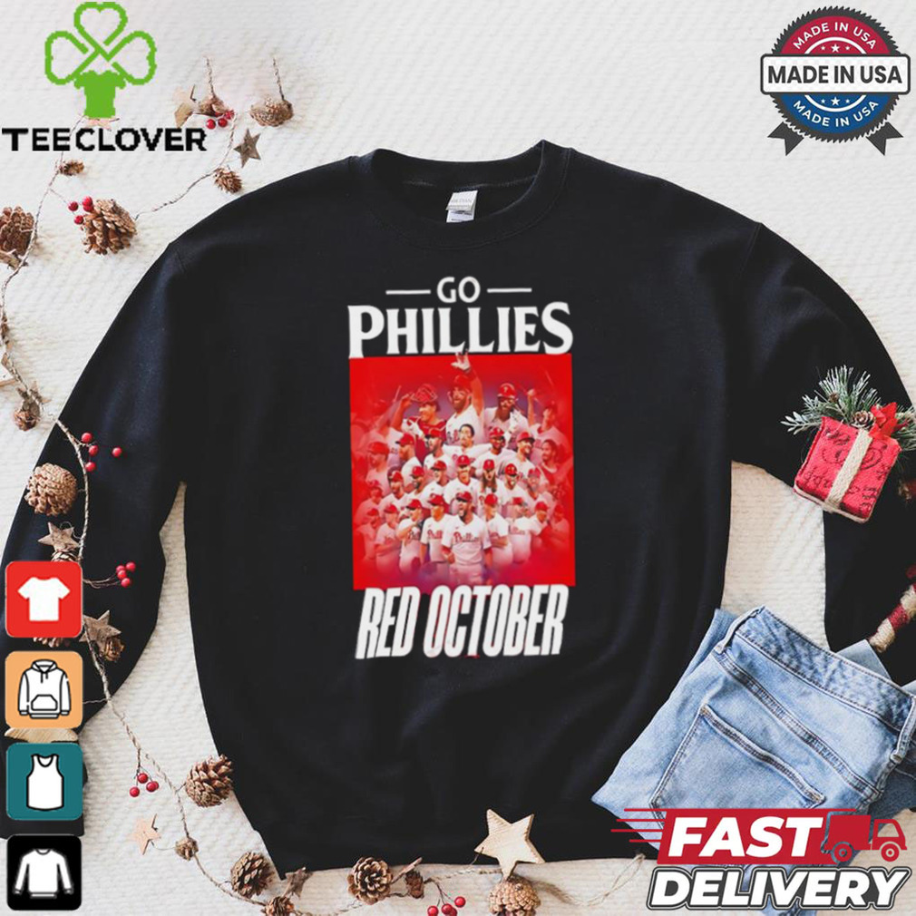 I do not remember Christmas Day itself that year, but the events around thePhiladelphia Phillies Go Phillies Red October NL East Division Champions graphic shirt this holiday changed my life forever. I was living in Los Angles at the time and was dirt poor as I was very underemployed. I did not have any ambition, but was content. I had a new girl friend (we had been dating for not yet six weeks). I was too poor to buy a Christmas tree. It had been raining for about a week, and was expected to raining for the next week (for those of you that do not know the weather for Los Angeles, this was highly unusual). Three days before Christmas I was driving around with my girlfriend doing some last minute Christmas shopping, when an announcement came on the radio that they were giving away free Christmas trees at a location about one half mile from where we were. I looked at my girlfriend and she said, βYes, letβs go get a Christmas treeβ A couple left turns later, there we were. There was a truck with two trailers full of Christmas trees trying to give them away. The owner of the property where the truck was park had call the police and wanted them to be charged with trespassing. He had Christmas tree lot down the street and this was killing his business.
