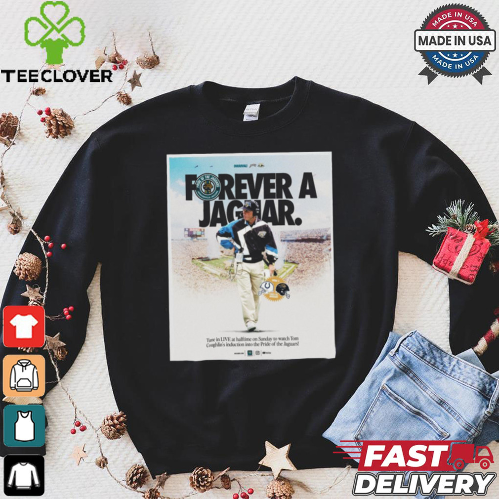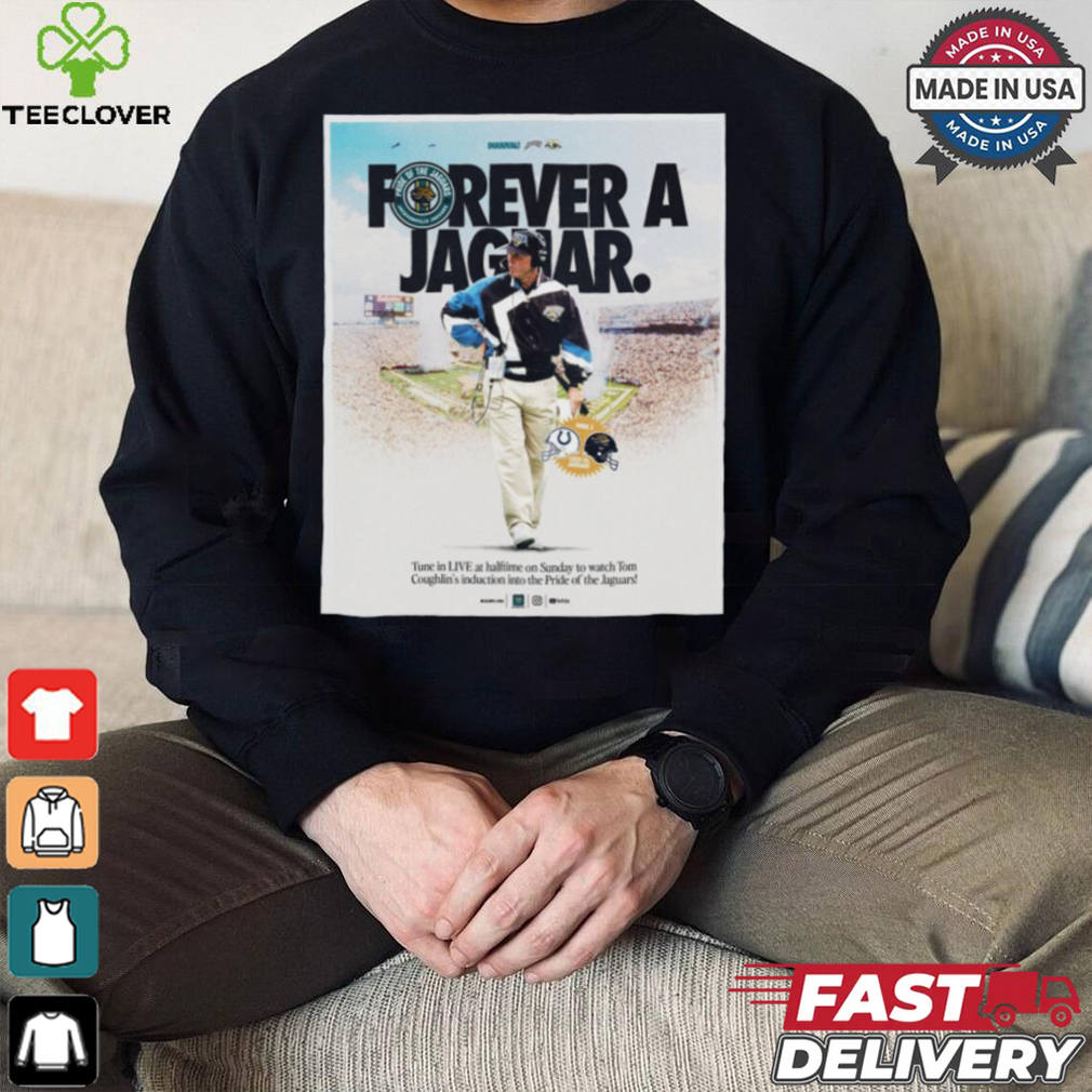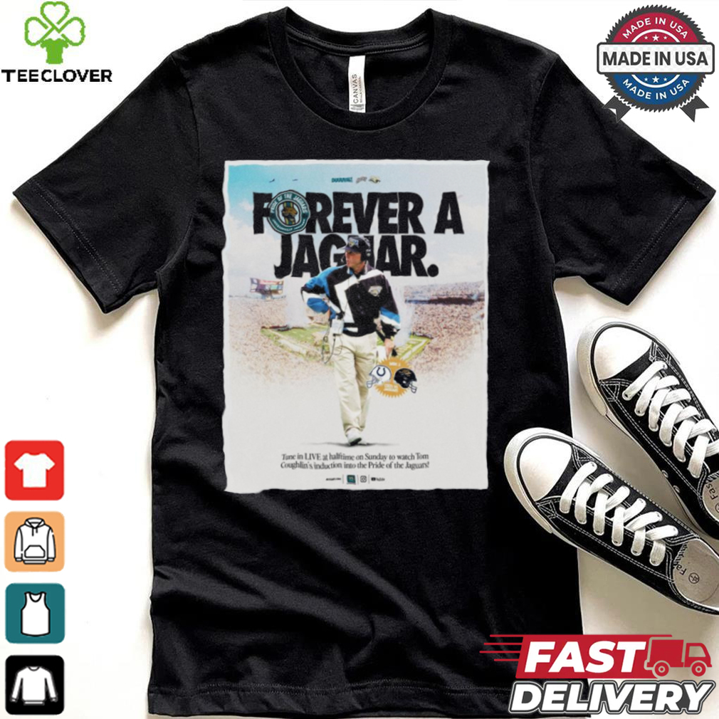 (The Bolshevik) sentinel slowly raised his head. But just at this moment the Poster Forever A Jaguar Tom Coughlin Week 5 NFL Jacksonville Jaguars vs Indianapolis Colts t shirt body of my friend rose up and blanketed the fire from me and in a twinkling the feet of the sentinel flashed through the air, as my companion had seized him by the throat and swung him clear into the bushes, where both figures disappeared. In a second he re-appeared, flourished the rifle of the Partisan over his head and I heard the dull blow which was followed by an absolute calm. He came back toward me and, confusedly smiling, said: “It is done. God and the Devil! When I was a boy, my mother wanted to make a priest out of me. When I grew up, I became a trained agronome in order. . . to strangle the people and smash their skulls? Revolution is a very stupid thing!” And with anger and disgust he spit and began to smoke his pipe.