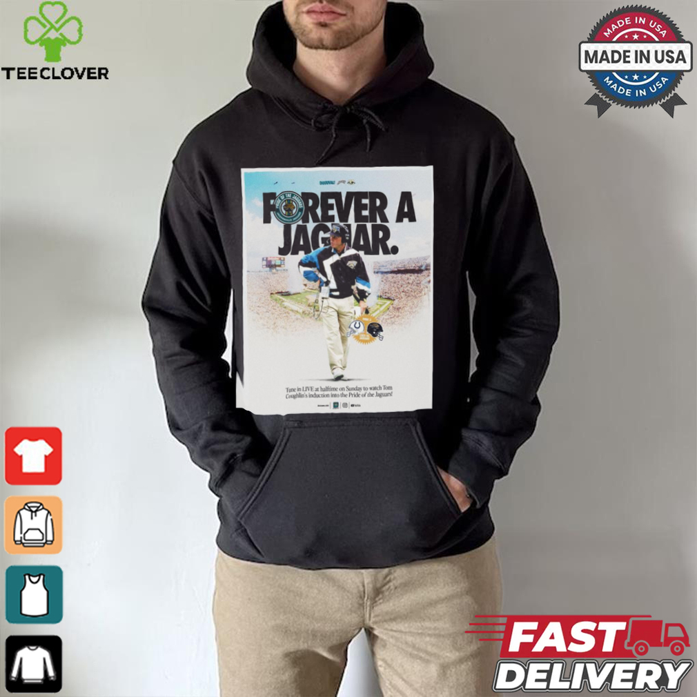 Beethoven turns his anger to Fate at having been dealt a Poster Forever A Jaguar Tom Coughlin Week 5 NFL Jacksonville Jaguars vs Indianapolis Colts t shirt and now, this decision. In consolation, Fate allows Beethoven to travel back through his life in order to review it and make any changes that he wishes. Beethoven accepts this and they begin with Beethoven’s experiences as a child. Beethoven comes into his room while the young Beethoven has just been slapped by a tutor for failing to receive appointment to the Imperial Court. Beethoven turns to Fate and informs her that he did not need the hardships that he had faced, with his mother dead and a painful childhood. He requests that she remove the experience from his life. After being told that such a request would remove the inspiration for his sixth symphony, he changes his mind. Fate and Beethoven then go to one of Beethoven’s happier moments, meeting the composer Wolfgang Amadeus Mozart in the city of Vienna. Fate then reminds Beethoven of his “immortal beloved” Theresa and after experiencing a fond remembrance, Beethoven explains his reasons for needing to leave her.