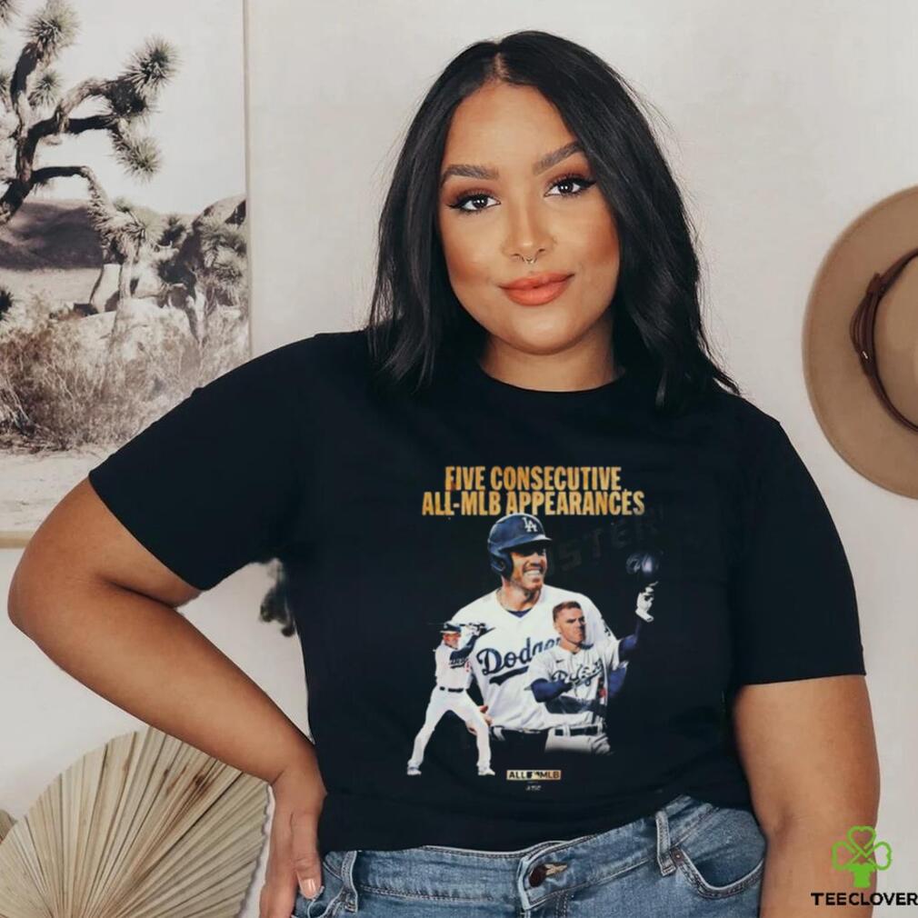 Quality Los Angeles Dodgers Freddie Freeman Five Consecutive All MLB Appearances Unisex T Shirt1 is a must-have for any Funny who loves all things teejeep. These shirts typically feature popular TrenΔing Shirt characters, quotes, or logos, and come in a range of styles and colors to suit any taste. Some designs may even feature the dadβs favorite Trending or characters, making them a personalized and thoughtful gift.