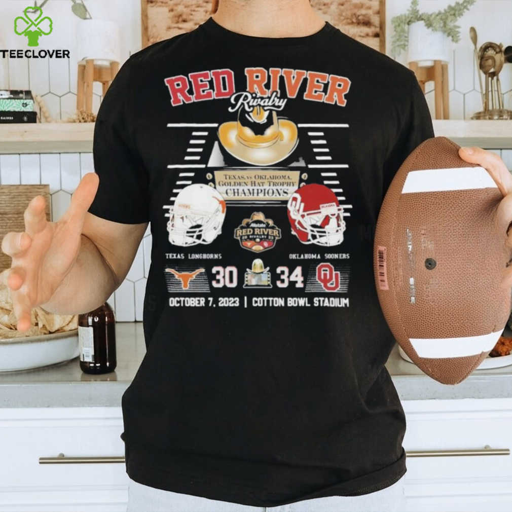 ()Red River Rivalry Texas Vs Oklahoma Golden Hat Trophy Champions Texas Longhorns 30 Oklahoma Sooners 34 October 7, 2023 Cotton Bowl Stadium T Shirt, Hoodie, Sweater, Vneck, Unisex and T-shirt