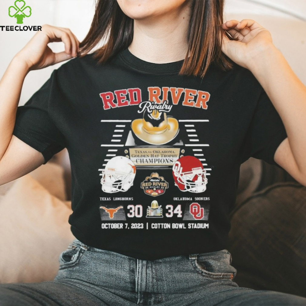 Best Red River Rivalry Texas Vs Oklahoma Golden Hat Trophy Champions Texas Longhorns 30 Oklahoma Sooners 34 October 7, 2023 Cotton Bowl Stadium T Shirt