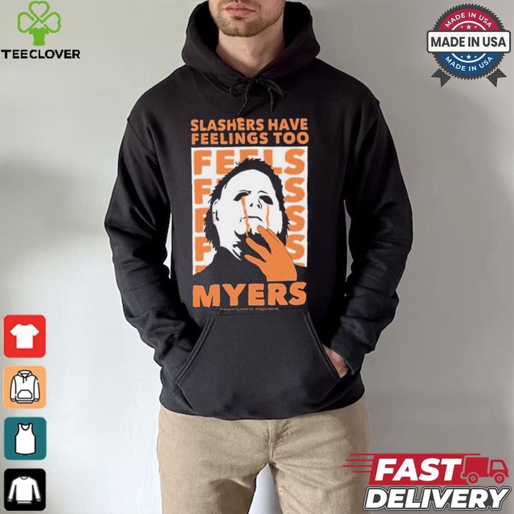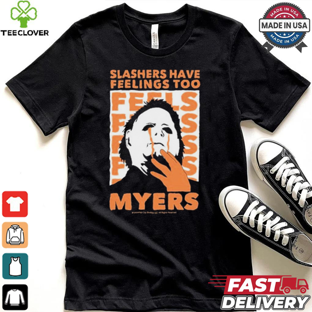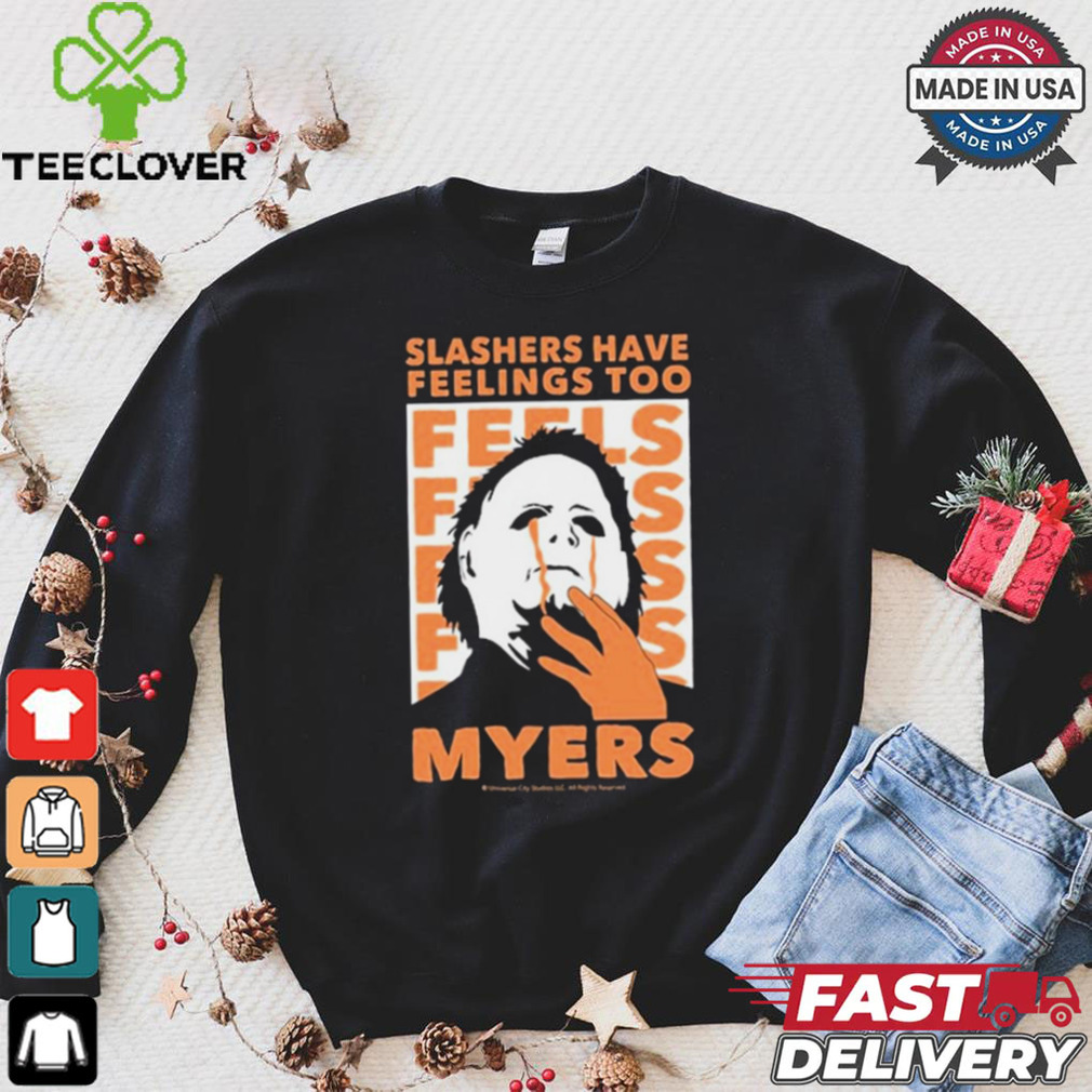 Around 11 AM, the Riot Society Halloween 2024 Michael Myers Slashers Have Feelings Too Painting t shirt arrived. Several large, police officers approached us. They told us that they were going to shut down the operation as it was causing a huge traffic jam. I got a brainstorm, I asked the officer that appeared to be in charge if I could have a word with him (Note, I was in my hippie mode at this time). He agreed. I said, βThese trees are free to anyone.β He said, βSo whatβ I said βthere are free to anyone, including the police department. You could pick up as many of the trees as you want and take them down to Watts (a very poor part of town) and give them away. Think of the PR you could get out of that.β The lights went on in his head and he turn around and talked to the other officers. I do not know what he said, but in a very short time, there were a lot more officers, but they were now directing traffic. Soon a large truck from the police department pulled up and they starting filling the truck with tress. They were already sending in an advance unit to prepare for the Christmas tree give away.