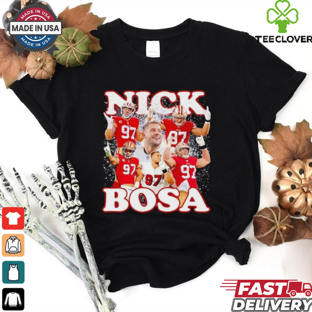 ()These are actually distinctive males’s weaves that make an San Francisco 49ers Nick Bosa “Niners Collage” shirt design and also provides the t-shirts fascinating tones. Each weaves are actually warmer than timeless poplin therefore are actually favoured in the chillier periods.A tshirt along with a mango surface has actually normally gone through a method through which the textile has actually been actually extremely gently affected – this provides it an additional smooth feeling. Guy’s and also women tshirts along with a mango or even carbon dioxide coating are actually typically informal t shirts.