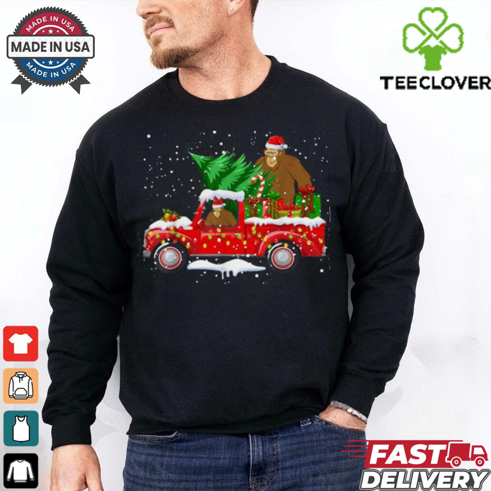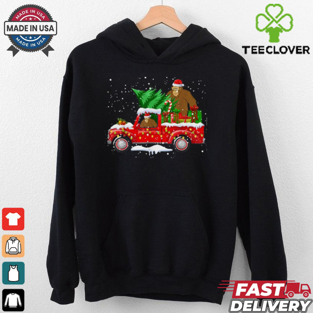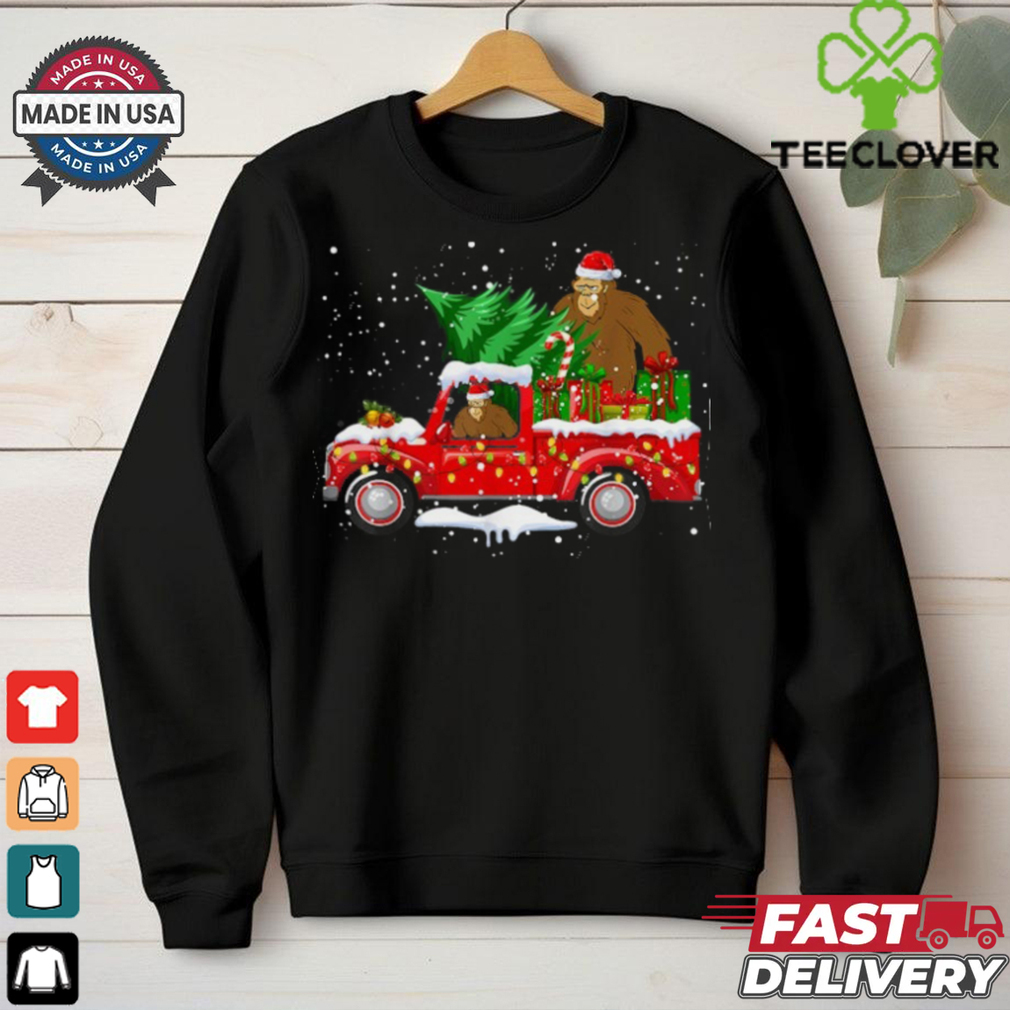 ()Santa Bigfoot Riding Red Truck & Xmas Tree Merry Christmas T Shirt Recovered hoodie, tank top, sweater and long sleeve t-shirt: best style for you