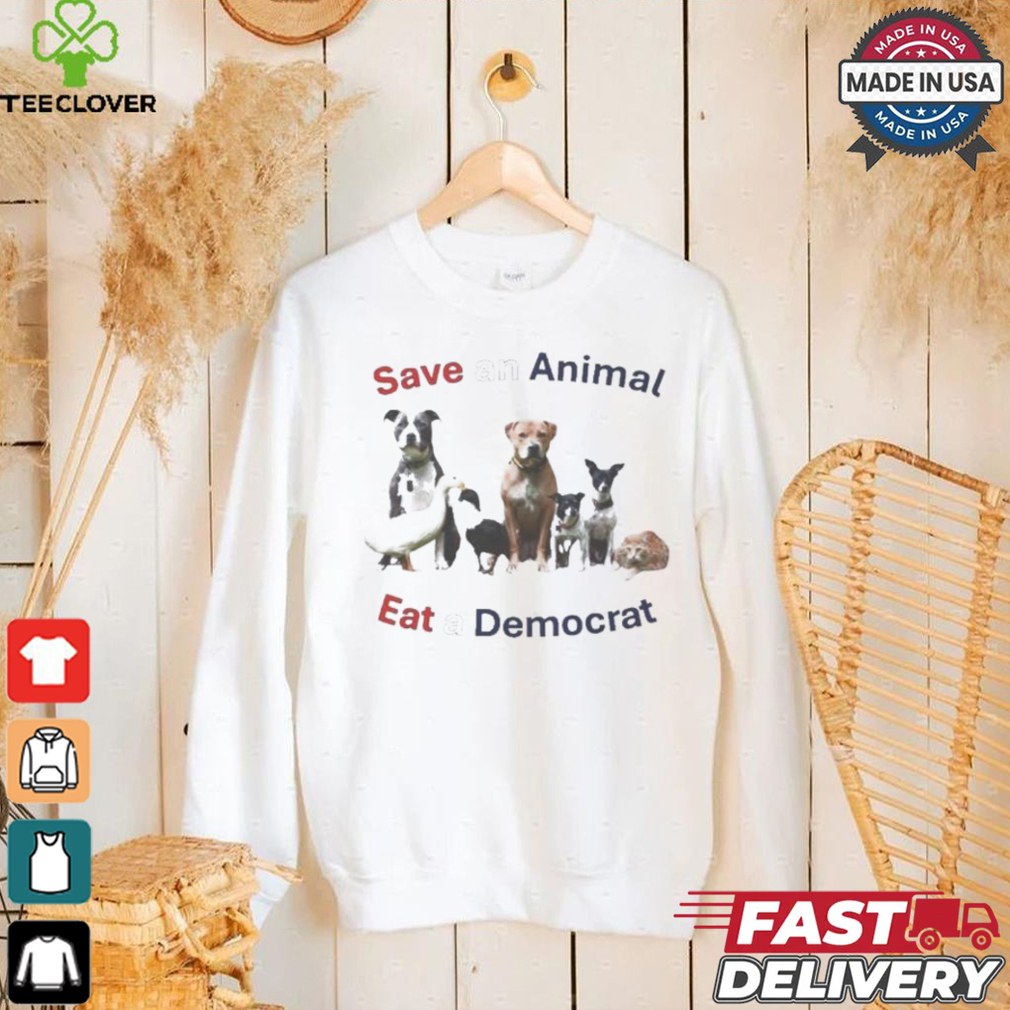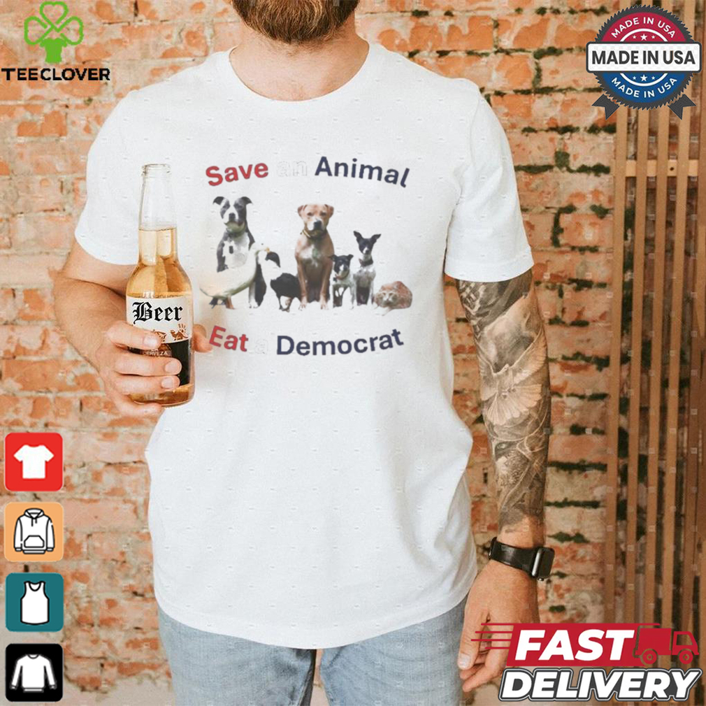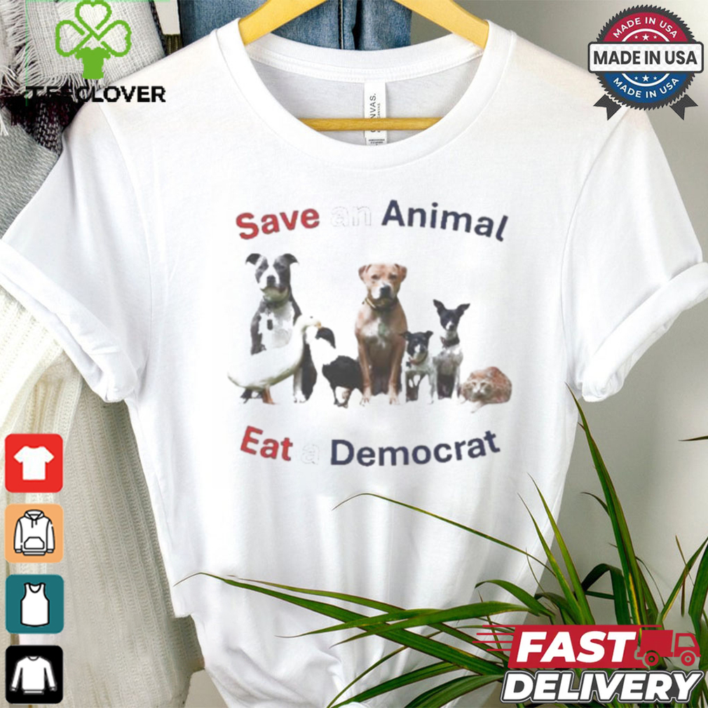 (The Bolshevik) sentinel slowly raised his head. But just at this moment the Save an Animal Eat a democrat Shirt body of my friend rose up and blanketed the fire from me and in a twinkling the feet of the sentinel flashed through the air, as my companion had seized him by the throat and swung him clear into the bushes, where both figures disappeared. In a second he re-appeared, flourished the rifle of the Partisan over his head and I heard the dull blow which was followed by an absolute calm. He came back toward me and, confusedly smiling, said: “It is done. God and the Devil! When I was a boy, my mother wanted to make a priest out of me. When I grew up, I became a trained agronome in order. . . to strangle the people and smash their skulls? Revolution is a very stupid thing!” And with anger and disgust he spit and began to smoke his pipe.