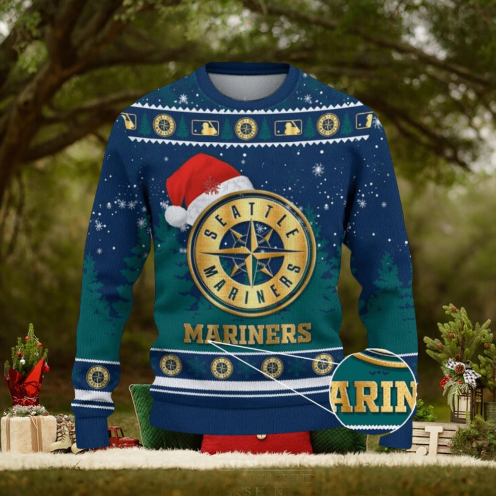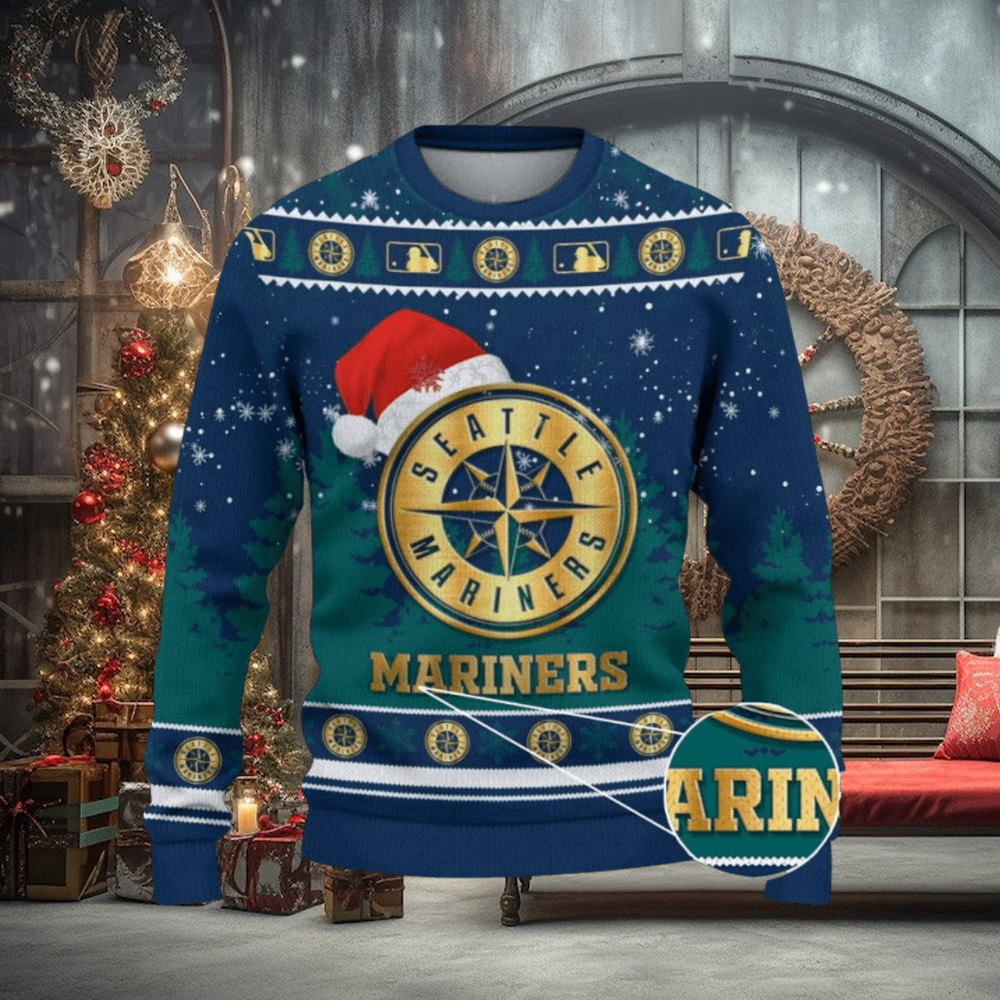 ()Seattle Mariners Logo Wearing Santa Hat Trending Christmas Gift AOP Ugly Christmas Sweater Men Women Winter Gift,