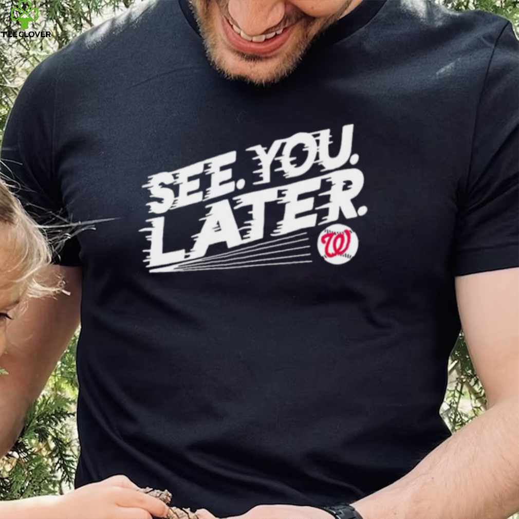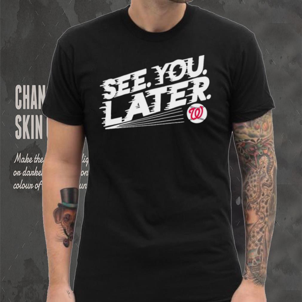 He See you later Washington Nationals baseball shirt his paws in his water bowl after he uses the litter box and then, of course, demands fresh water. And, he has zero interest in people food. He only likes certain brands of dry cat food and literally refuses to eat anything else. Once when we ran out of cat food, I tried to give him a can of salmon. I sat it down in his bowl and told him not to get used to such special treats. He looked down at it, looked up at me, looked back down and sniffed it. Then he stepped halfway over it, looked up at me in disgust and started scratching the floor like he would if he were covering up poop, as if to say, “This smells like crap.”