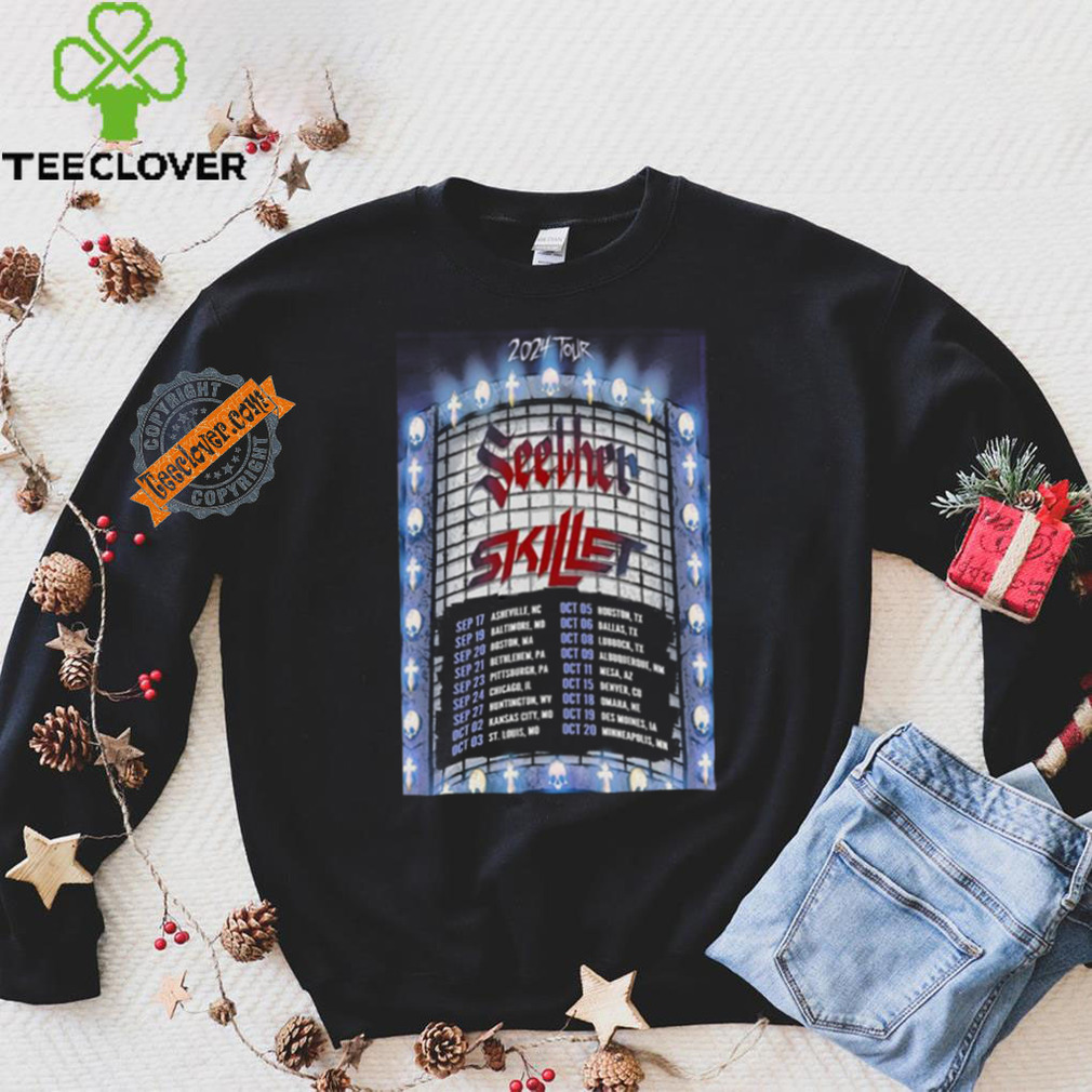 The truckers were speculator and had invested in the Christmas tree to sell to Christmas tree lots so they would have fresh trees. In the past years this had worked out very well, but because of all the Seether Skillet 2024 Tour Poster Shirt , no one wanted the tree. They were going to have to pay to bring them to the dump, so they decide to give them away. I asked the cop and the owner if I could find a place for them to move to, would let them go, it is Christmas. They agreed. I phoned the radio station (a long time before cell phones, this was done on a pay phone) I told them what the problem, the trees were free, but they needed some place to put the trees.