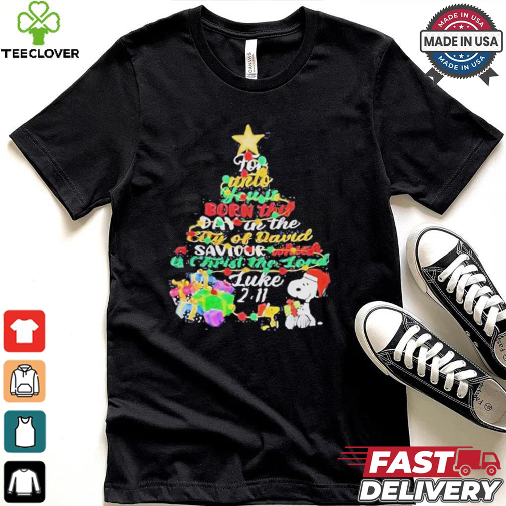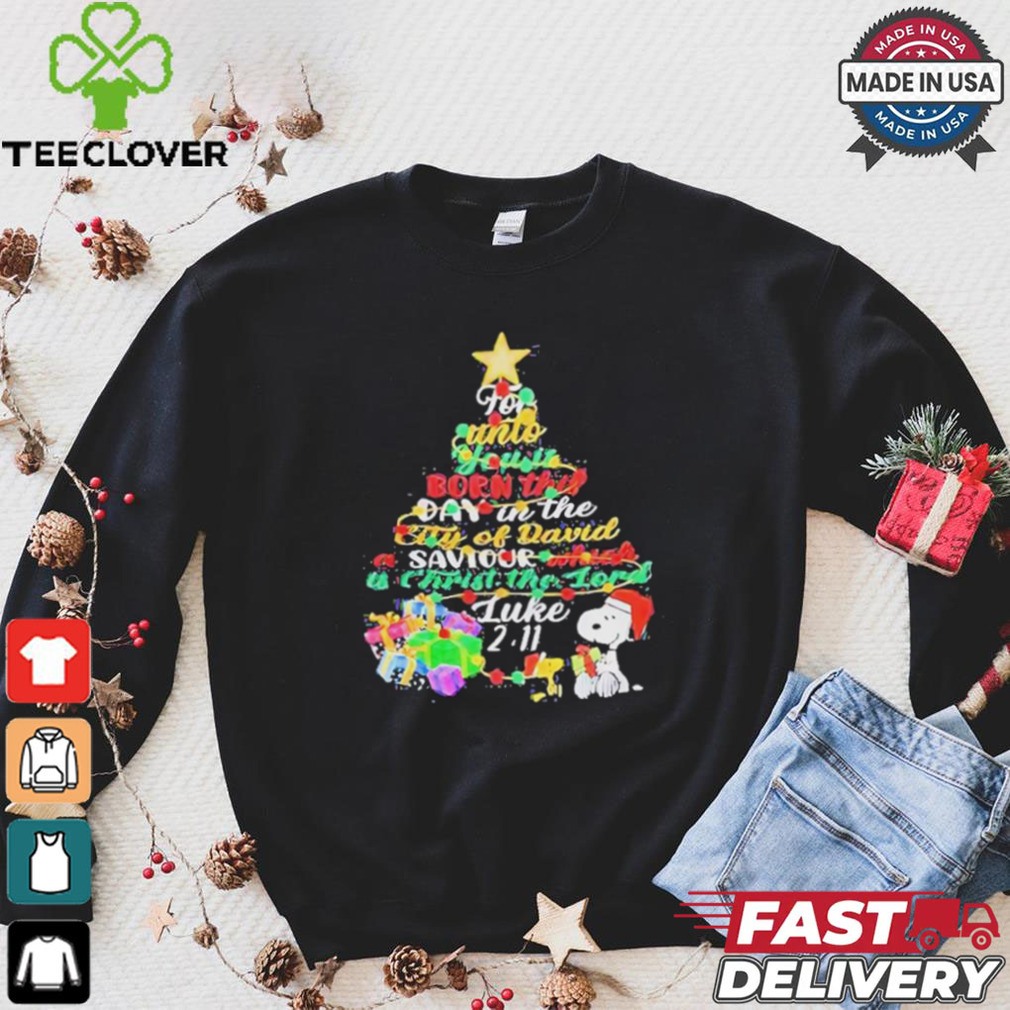 Snoopy for unto you is born this day in the city of david a saviour which is Christian Merry Christmas shirt