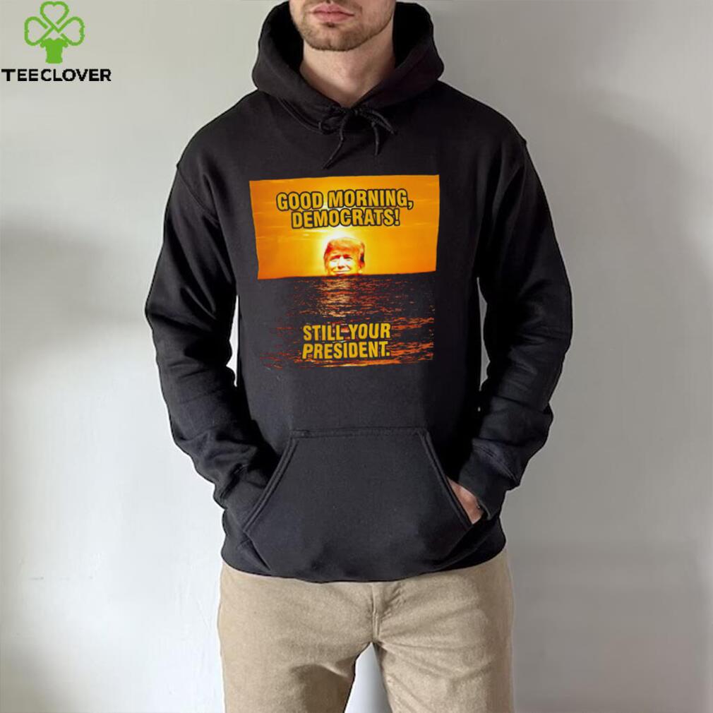(Sunrise of Trump Good Morning democrats still your President shirt, sweater)Categories Holidays, Fathers Day, Mothers Day of this men’s, women’s t-shirt, hoodie, sweatshirt and plus size, all sizes from Dad, Family, Liberals. This t-shirt has all kinds of colors black, white, navy, red that is very suitable for trending or holidays for Sunrise of Trump Good Morning democrats still your President shirt