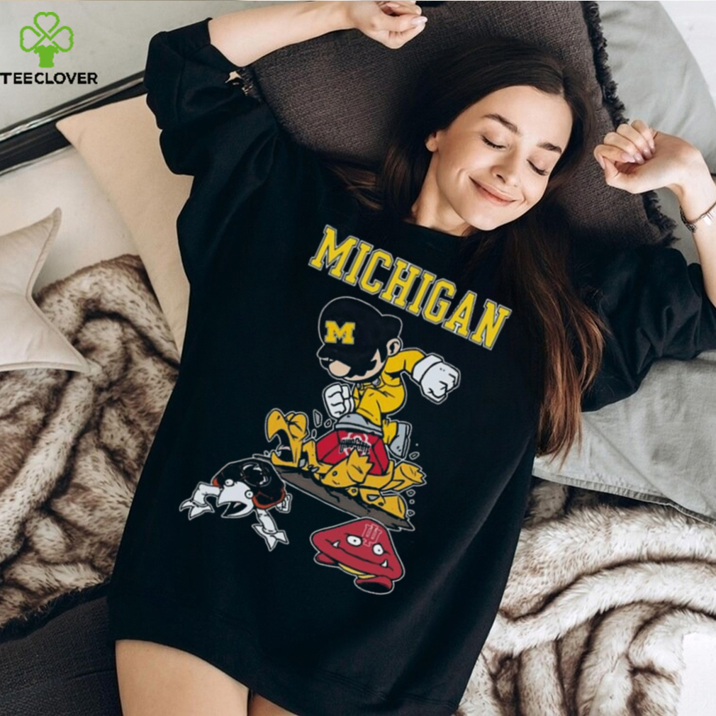 It’s a Super Mario Michigan wolverines stomp Ohio state buckeyes penn state and Indiana hoosiers Shirt kidβs movie that adults can enjoy. The only bad language is done in a cutesy way, with unintelligible sounds, kind of like the adults always talked in Peanuts cartoons. Ralph gets his mouth washed out with soap for it. The only violence is a scene where Ralph, while being picked on by a bully, snaps and fights back. It isn’t overly violent, and it isn’t glorified fighting, it’s just a couple of kids fighting in the snow like kids do. Ralph is crying throughout, so it is not some kind of ‘Aha, the victim has turned the tables with violence!’ I think the only other scene of violence is where Ralph fantasizes that he defends the house from burglars in the backyard with a BB gun. The scene is in black and white and sped up like a funny silent movie, and the burglars wear comical, old timey burglar outfits – striped shirt and black masks, like the Hamburglar. I think Ralphie shoots them in the butt as they try to climb back over the fence to get away.