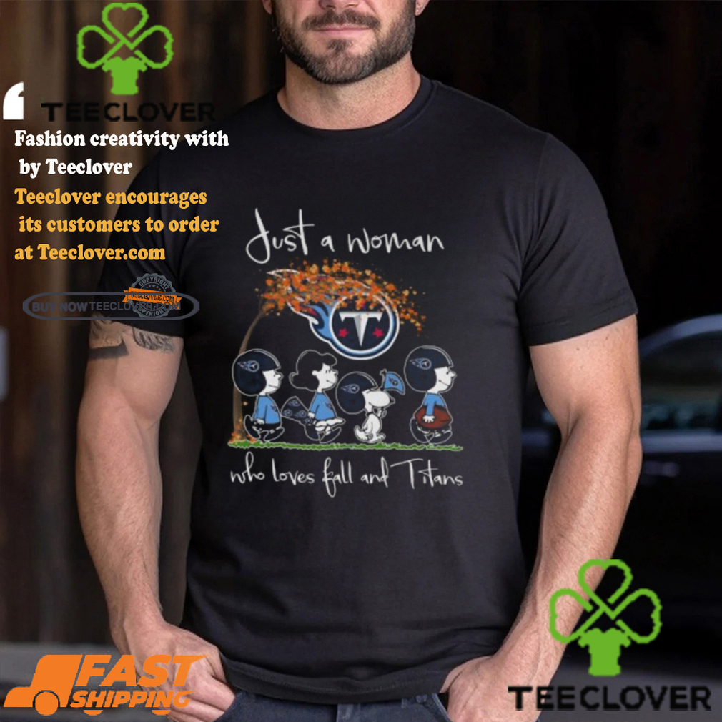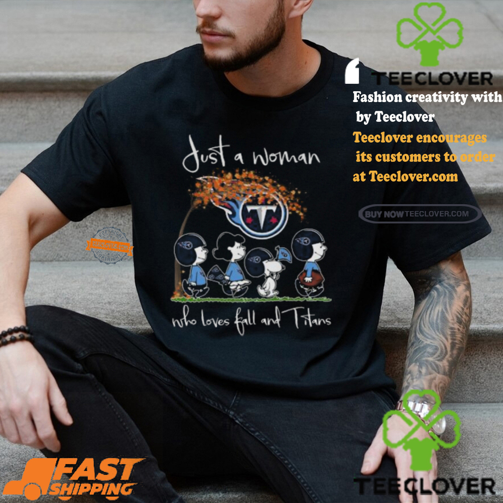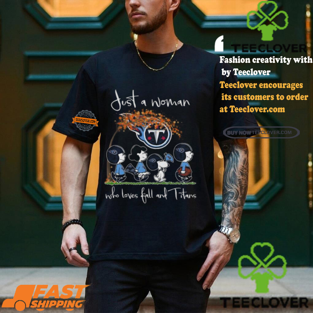 ()Tennessee Titans Snoopy Just A Woman Who Loves Fall And Titans T Shirt hoodie, tank top, sweater and long sleeve t-shirt