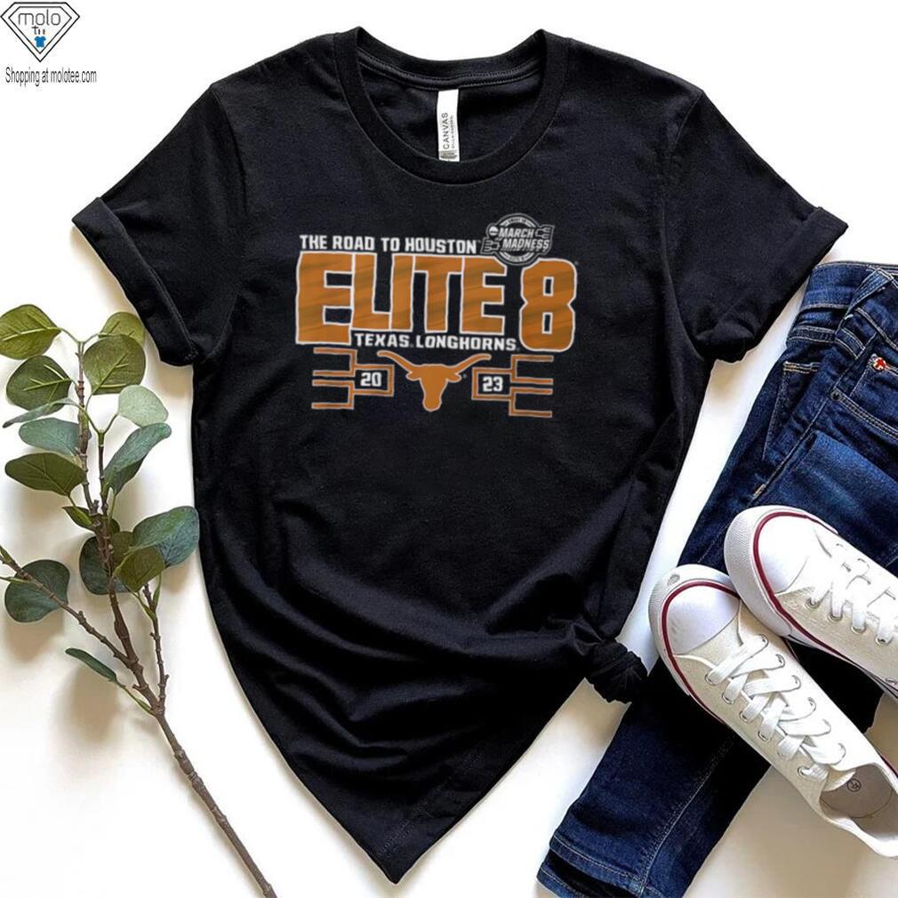 Angry at having his time wasted, he throws accusations of Texas Longhorns Elite 8 2023 Basketball Black T Shirt at Flaherty and disbelief at Corwin’s claim that the bag is supernatural. Dundee challenges Corwin to produce a bottle of cherry brandy, vintage 1903. Corwin reaches into the bag to hand Dundee his exact request, and is set free. He continues to distribute gifts until midnight, when the bag is empty. A man named Burt, whose desired pipe and smoking jacket had come from Corwin’s bag, sees Corwin again and points out that Corwin himself has not received a gift. Corwin says that if he had his choice of any gift at all, “I think I’d wish I could do this every year”. Returning to the alley where the gift-laden bag had presented itself, he encounters an elf sitting in a large reindeer-hauled sleigh, waiting for him. Realising that his wish has come true and he is now the real Santa Claus, Corwin sits in the sleigh and sets off with the elf. Emerging from the precinct, Flaherty and Dundee, now slightly tipsy from Corwin’s brandy, look upward upon hearing the tinkle of bells and see Corwin, in Flaherty’s words, “big as life, in a sleigh with reindeer, sittin’ next to an elf”, ascending into the night sky. Dundee invites Flaherty to accompany him home and share some hot coffee, with brandy poured in it, adding, “…and we’ll thank God for miracles, Flaherty…