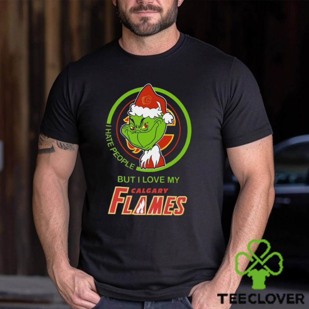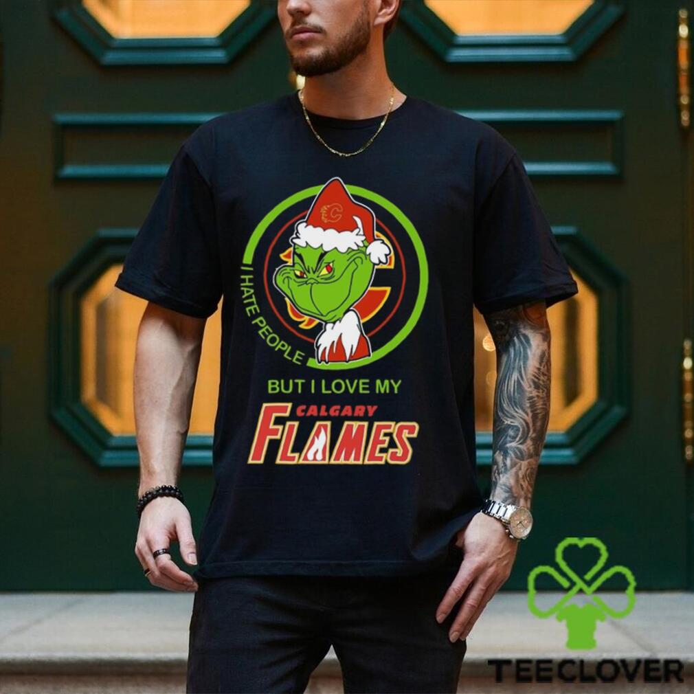 No, I’m very comfortable with saying “Merry Christmas” to people. I’m atheist as well, and I celebrate Christmas. The vast majority of the The Grinch I Hate People But I Love My Calgary Flames Logo T Shirt of Christmas are secular, ranging from the general motive of exchanging gifts and spending time with your loved ones all the way to Santa Claus and Rudolph the Red Nosed Reindeer. Christmas these days is about as secular as paying cash (In God We Trust), going to elementary school (saying the Pledge of Allegiance), or going to court (Ten Commandments in front of court houses): in other words, while it’s still a tiny bit religious and it does make me a bit uncomfortable, they are still for the vast majority secular and I still willingly participate in these activities.