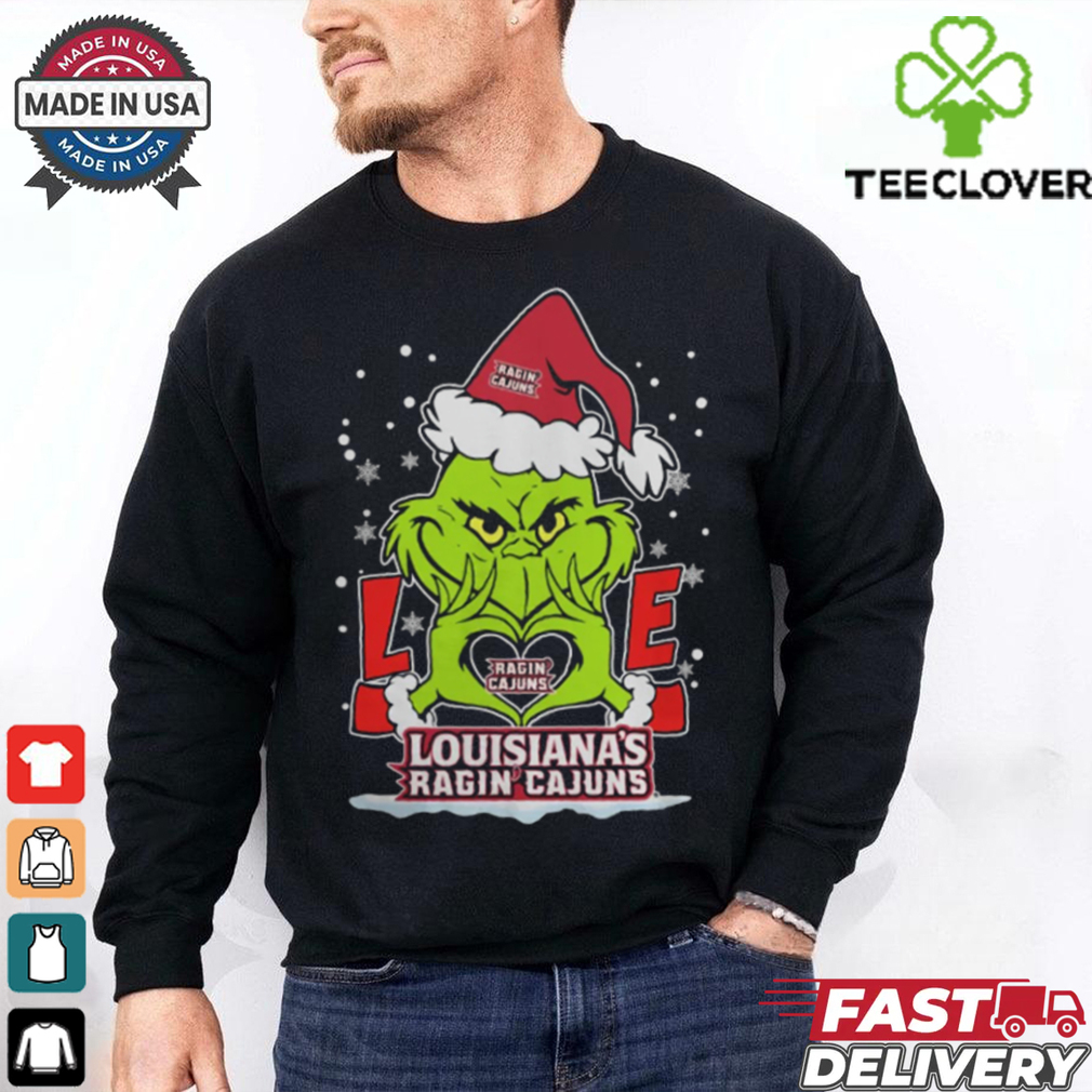 About 2 months later, I ended up going to The Grinch Love Heart 2024 Louisiana Ragin’ Cajuns Football Christmas Shirt , and thanks to having everything cleared up, I only ended up with 40 hours of community service. But still, this is something that could have messed up things until I turned 18. Still, everything was straightened out, the store had decided not to press any charges and the judge had his giggles at my expense. In the end, there was no damage and my actions weren’t intentional to peek at women so blatantly and incompetently after all, and store cameras confirmed that I had run in suddenly in a panic and dropped everything, which matched my story.