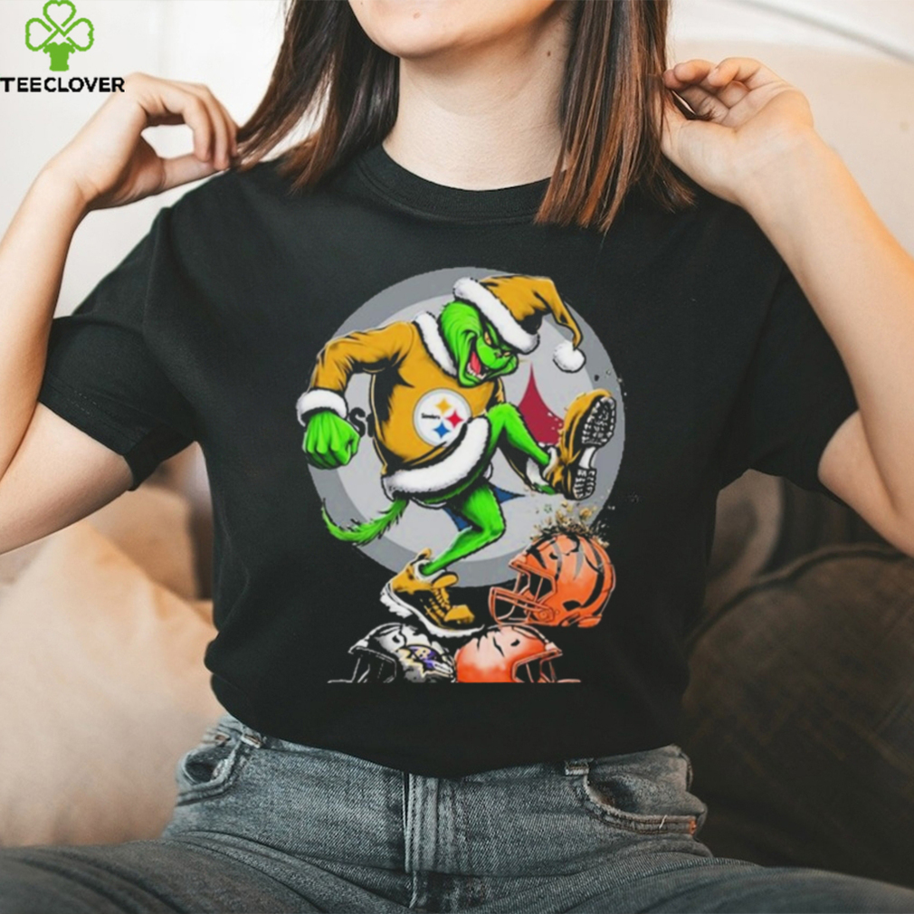 Geography. Pick the local team. If you are in say Miami, congratulations you can be a Dolphins fan and if you want to support teams across several levels, then the Dolphins for the NFL, Miami Hurricane among the power college programs and Florida International Panthers in the so-called Group of 5. If you are in an area not near an NFL team pick a The Grinch Pittsburgh Steelers Stomp On NFL Teams Christmas Shirt college and could even find enjoyment following a small regional team that plays in Division II or III or Division I FCS. Aesthetic reasons. You like the dark blue and orange combo of the Denver Broncos then that can be your team (also opens up the Boise State Broncos in college football). Iβm a Denver Broncos fan and Kansas City is a The Grinch Pittsburgh Steelers Stomp On NFL Teams Christmas ShirtΒ rival but I have to admit I like their home uniform. Like red and black? That gives you the Atlanta Falcons in the NFL, Texas Tech and Arkansas State and Cincinnati just off the top of my head. I donβt like the University of Texas but I happen to think their road uniform is one of the best in college football.