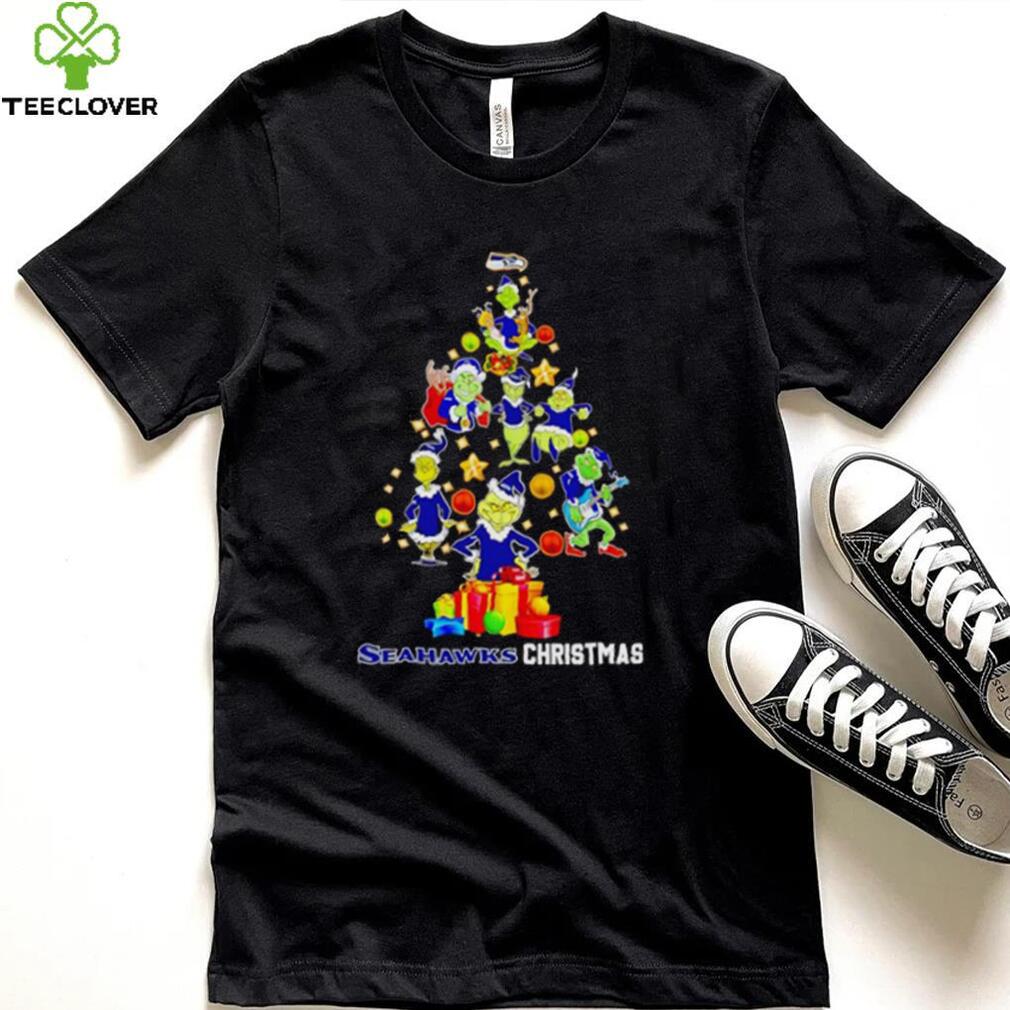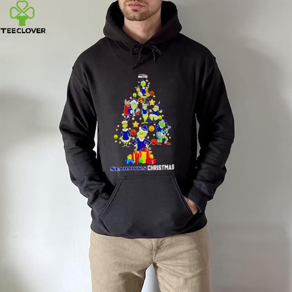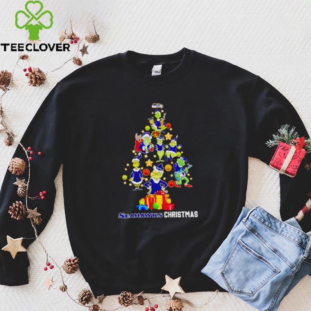 It’s a The Grinch Seahawks Christmas tree shirt kidโs movie that adults can enjoy. The only bad language is done in a cutesy way, with unintelligible sounds, kind of like the adults always talked in Peanuts cartoons. Ralph gets his mouth washed out with soap for it. The only violence is a scene where Ralph, while being picked on by a bully, snaps and fights back. It isn’t overly violent, and it isn’t glorified fighting, it’s just a couple of kids fighting in the snow like kids do. Ralph is crying throughout, so it is not some kind of ‘Aha, the victim has turned the tables with violence!’ I think the only other scene of violence is where Ralph fantasizes that he defends the house from burglars in the backyard with a BB gun. The scene is in black and white and sped up like a funny silent movie, and the burglars wear comical, old timey burglar outfits – striped shirt and black masks, like the Hamburglar. I think Ralphie shoots them in the butt as they try to climb back over the fence to get away.
