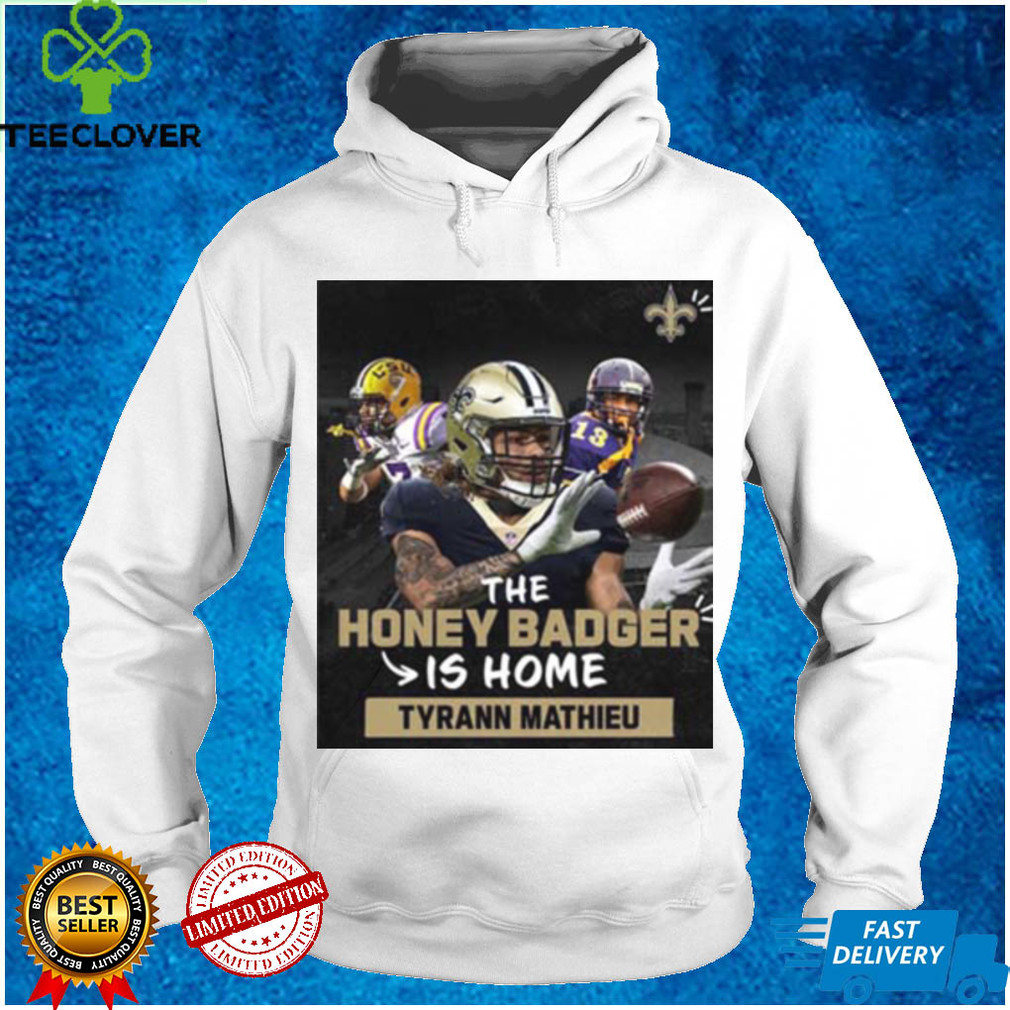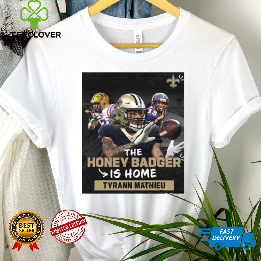 The storms are fierce, and can last for days. Weβve had our house buried in on the first floor more than once, and many homes have second stories so people can get out easily in the winter, LOL! But youβll own numerous shovels and be ready to use them; when I was small, we had a The Honey Badger Is Home Tyrann Mathieu New Orleans Saints T Shirt with an unheated porch, so we could shovel snow into that room before we shoveled it out again. Most people donβt mind, they have good heat. Up north, oil is more popular (sometimes youβre north of the treeline in some places in Nfld and Labrador), but there are a lot of places that have wood furnaces, and the autumnβs spent cutting wood you can tow out with a 4-wheeler (or skidoo is easy, once the snow is down), to keep you warm. Electric heatβs traditionally come in third, and I never encountered natural gas heat until I hit the continent.