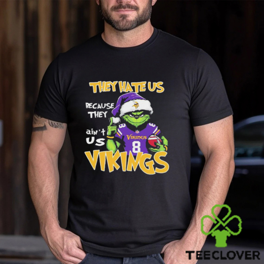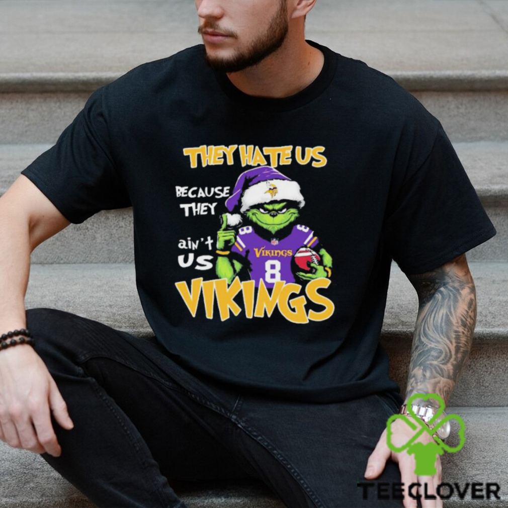 No, I’m very comfortable with saying “Merry Christmas” to people. I’m atheist as well, and I celebrate Christmas. The vast majority of the They Hate Us Because Ain’t Us Grinch Minnesota Vikings Christmas Shirt of Christmas are secular, ranging from the general motive of exchanging gifts and spending time with your loved ones all the way to Santa Claus and Rudolph the Red Nosed Reindeer. Christmas these days is about as secular as paying cash (In God We Trust), going to elementary school (saying the Pledge of Allegiance), or going to court (Ten Commandments in front of court houses): in other words, while it’s still a tiny bit religious and it does make me a bit uncomfortable, they are still for the vast majority secular and I still willingly participate in these activities.