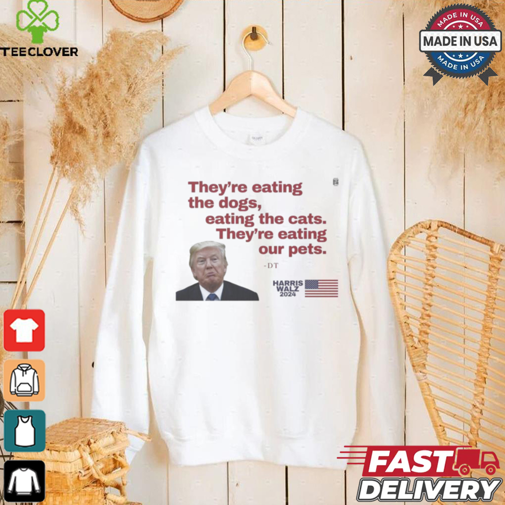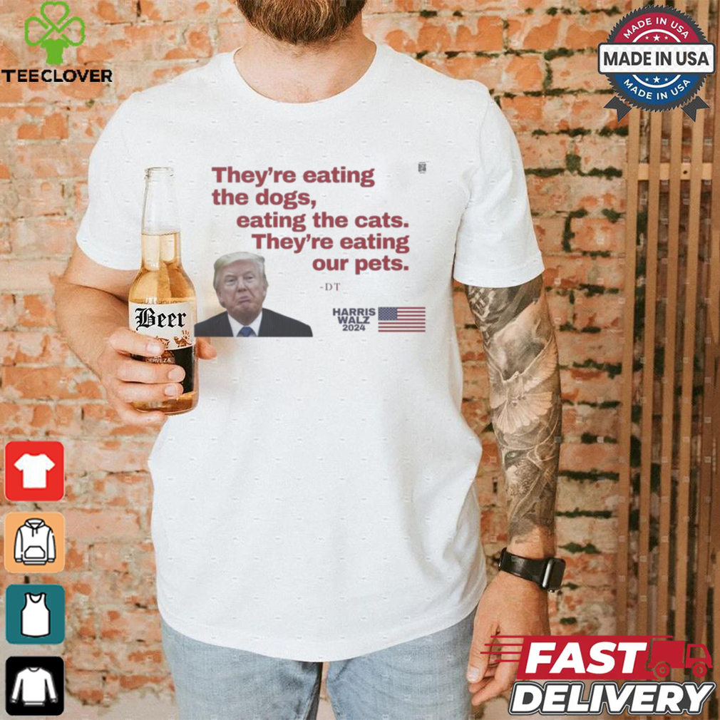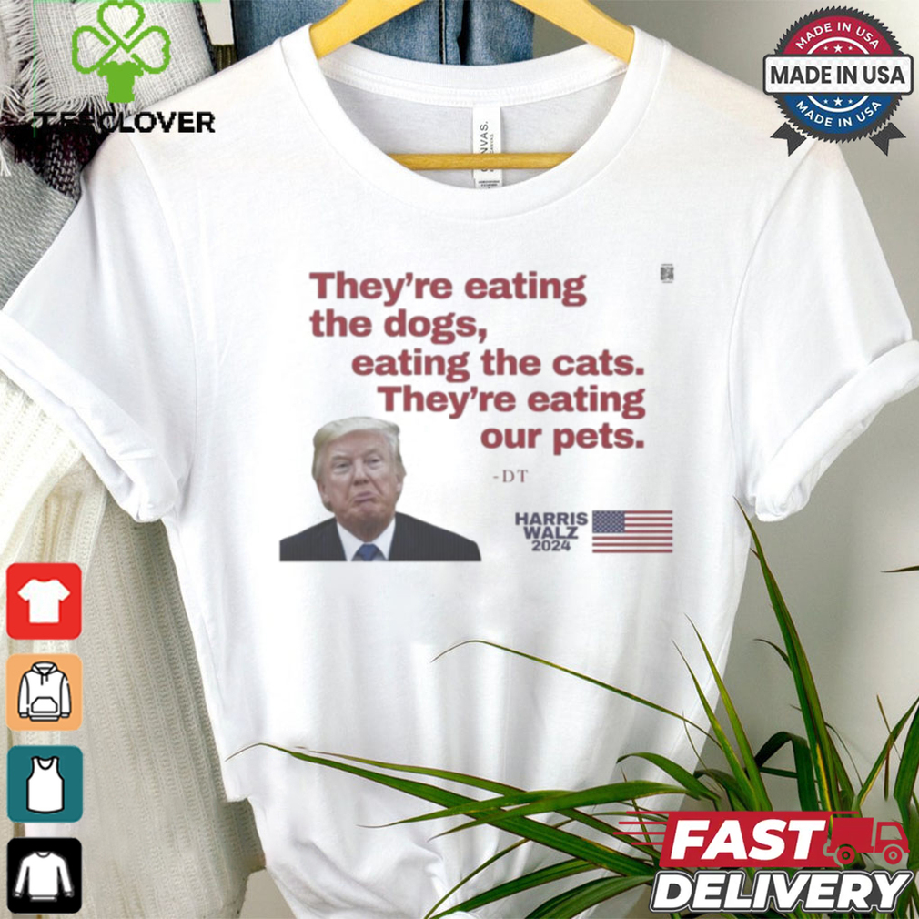 My grandfather was fond of They’re eating our Pets – Harris Walz 2024 shirt. When diabetes affected his legs and made him immobile, he continued to whistle. When glaucoma affected his eyes and he lost his eyesight, he continued to whistle. As someone in her early 20s, I found my granddad’s immense pleasure from life overwhelming and infectious. Here was a person who was losing all his senses, yet was gracious enough to utilize and maximize his happiness from the senses he still retained. Try whistling. It improves your lung capacity and will send more oxygen into your bloodstream, making you feel better instantly.Try cooking. I hear it is quite therapeutic when used to counter depression. Try duck meat (if you eat non-veg). If you have trouble sleeping, I read that tryptophan (an amino acid in duck meat) puts you to sleep instantly. Alternatives: try honey with milk before sleeping.