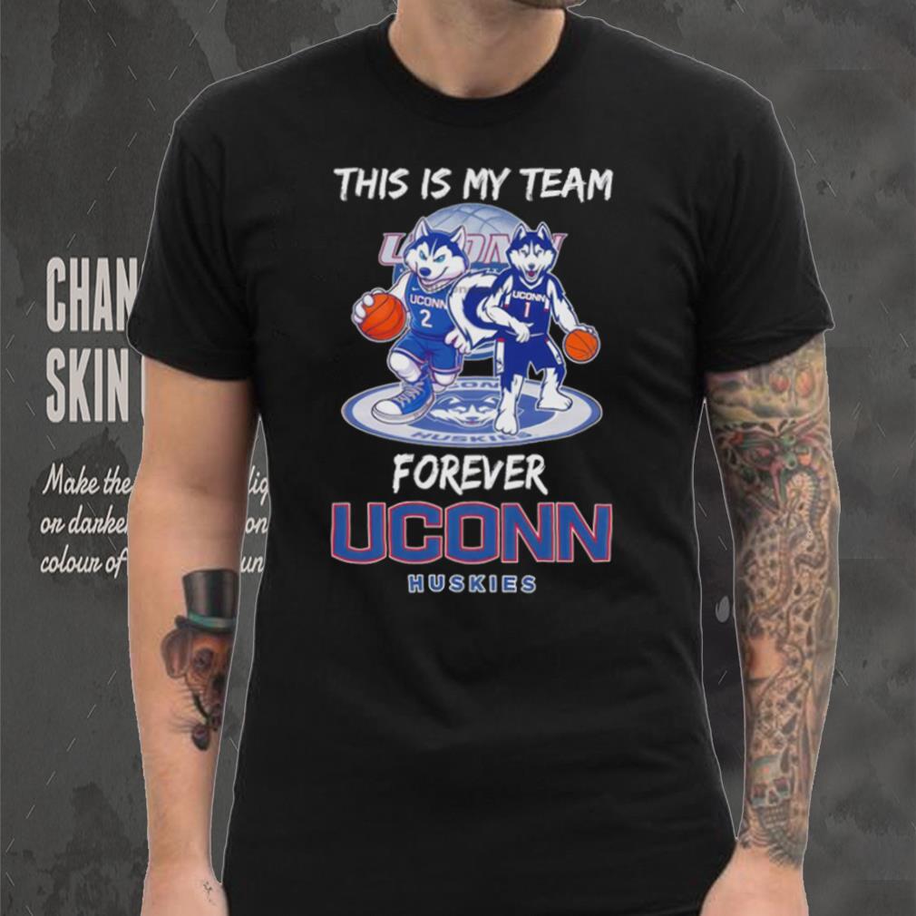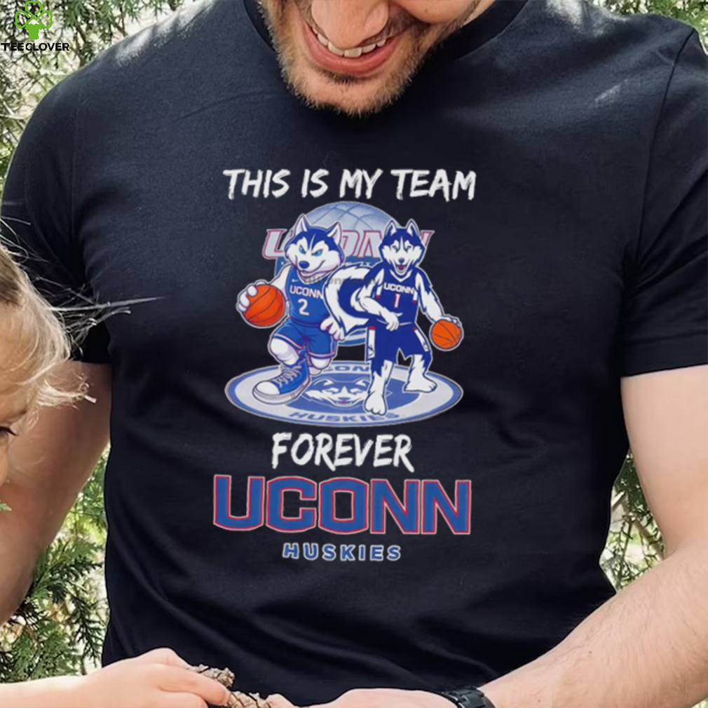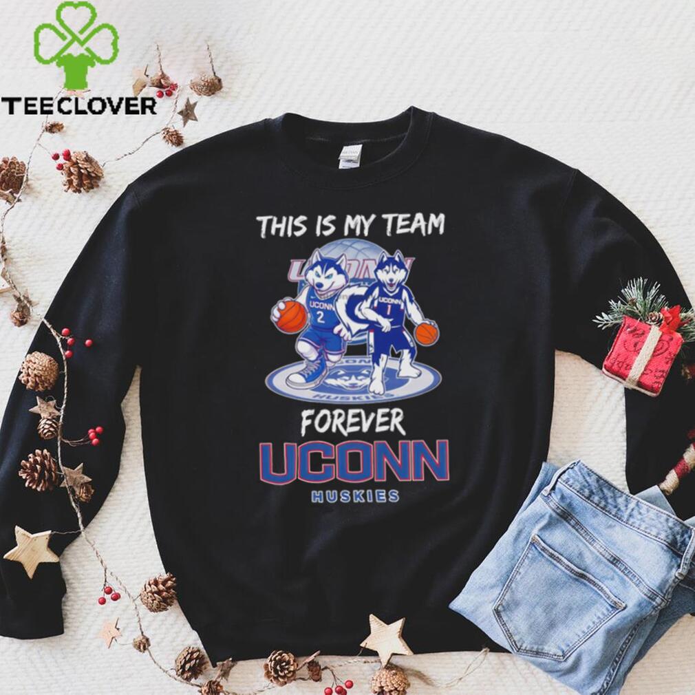 The This is my team forever UConn Huskies basketball mascot shirt to when Beethoven first realizes his deafness and he explains that Theresa would not love him were she to know. He is then shown Theresa’s reaction to his unexplained absence and he realizes that his deafness is the cause of all his problems. Fate explains that if she cures his deafness his music will suffer, as the Muses would not be heard as easily through the everyday sound. He thus withdraws his request. Beethoven is then shown that Theresa would have loved him forever and he becomes very sorrowful. But Fate then offers visions of the countless musicians of the future who would be influenced by Beethoven’s works. As one last, ultimate vision he is allowed to improvise with the musicians of the past and future who were inspired by him. Realizing that removing the hardships from his life would destroy his music, Beethoven informs Fate that he will not change any part of his life.