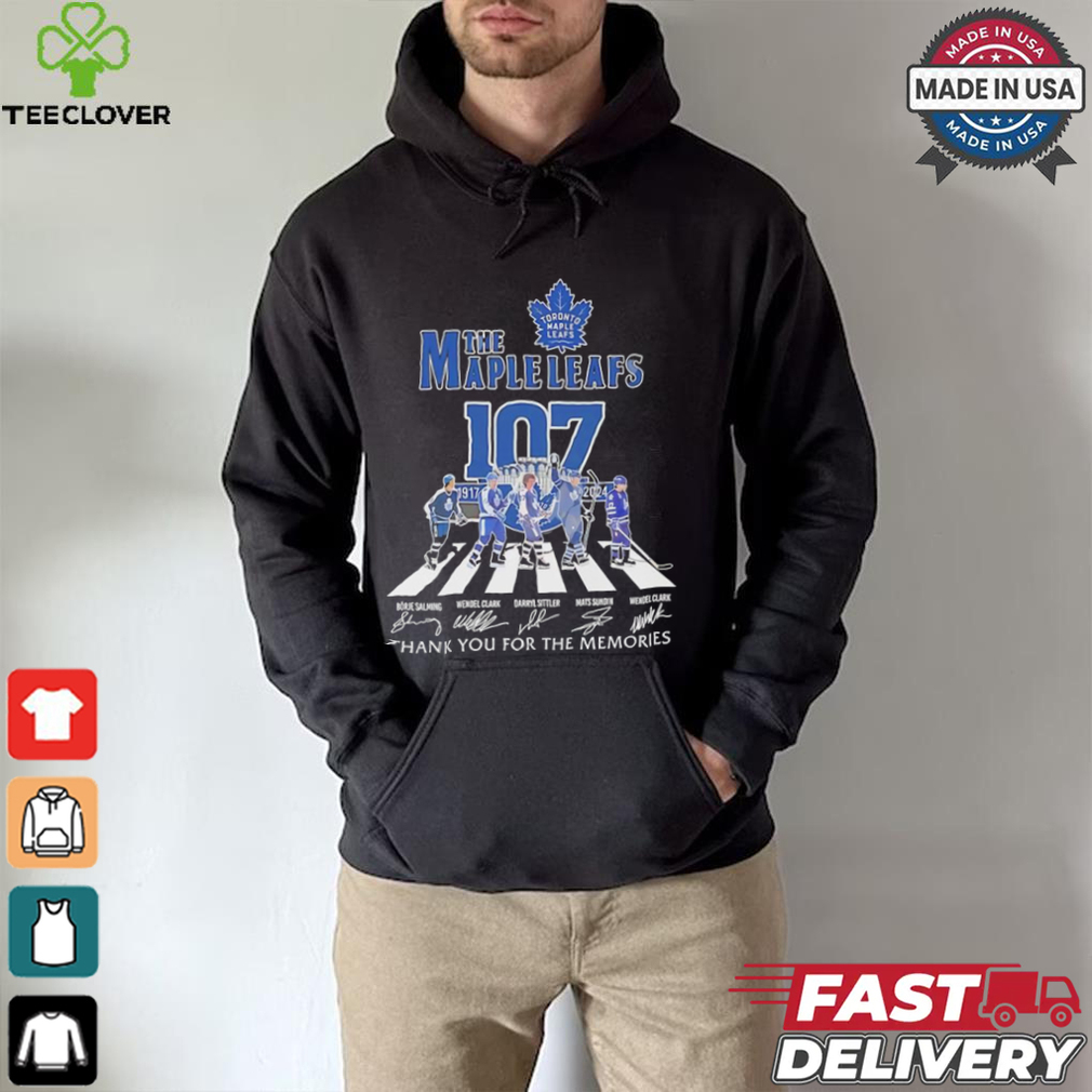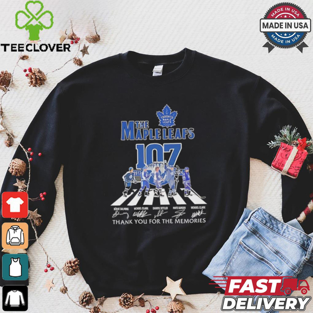 Everyone was now in good mood, including the Toronto Maple Leafs 107th Anniversary 1917 2024 thank you for the memories signatures shirt . We had a grand time giving away tress. And we gave away thousands of trees. My girlfriend and I had just spent the last three days in a heavy rain, giving away free Christmas trees. Everyone made the best of a rainy situation. This put us both in a very good mood. I do not have any memories of Christmas day; however, two days later I asked my girlfriend if she would marry me. We had been dating all of six weeks. She said yes. We now have been married for over 45 years and often think about the βGreat Christmas Tree Caperβ around the holiday.