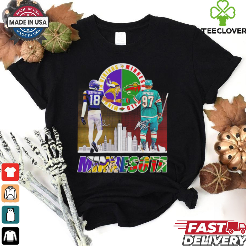 ()A lot of started to examine the Puritanism of the Vikings Justin Jefferson x Wild Kirill Kaprizov Minnesota skyline shirt , Victorian buttoned-down suggestions of discreetness were actually beginning to provide method to scantier as well as scantier swimwears, ankle-bearing skirts, and also short-sleeved t-shirts. As World War One impended upon the perspective, the tee was actually regarding to be actually conscripted to the military Port Coquitlam.