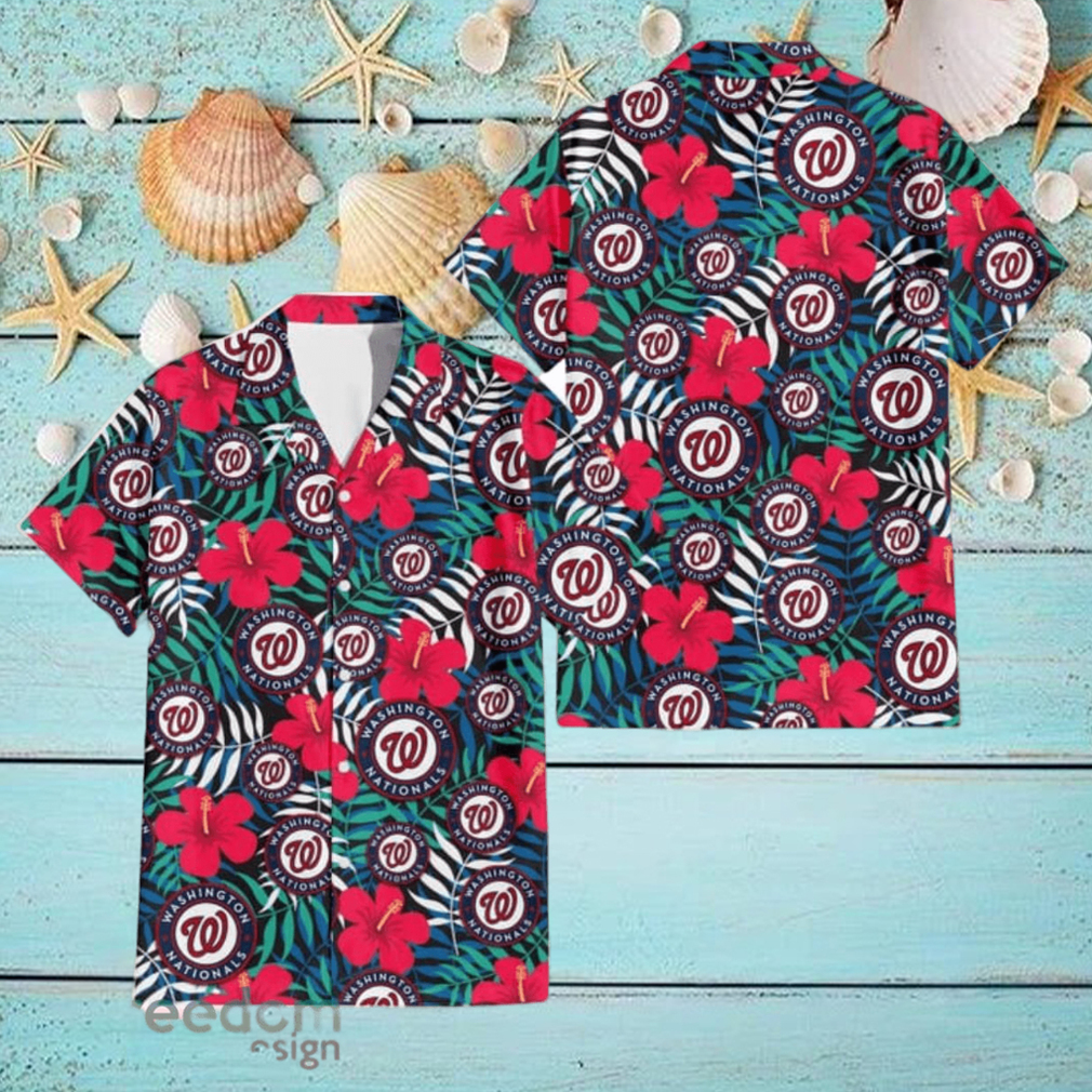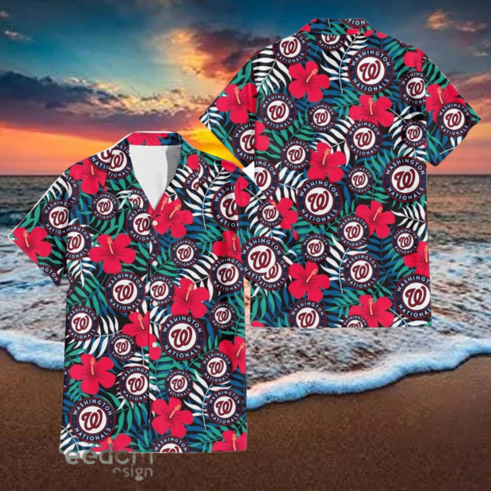 ()Washington Nationals Red Hibiscus Green Blue White Leaf Black Background 3D Hawaiian Shirt,