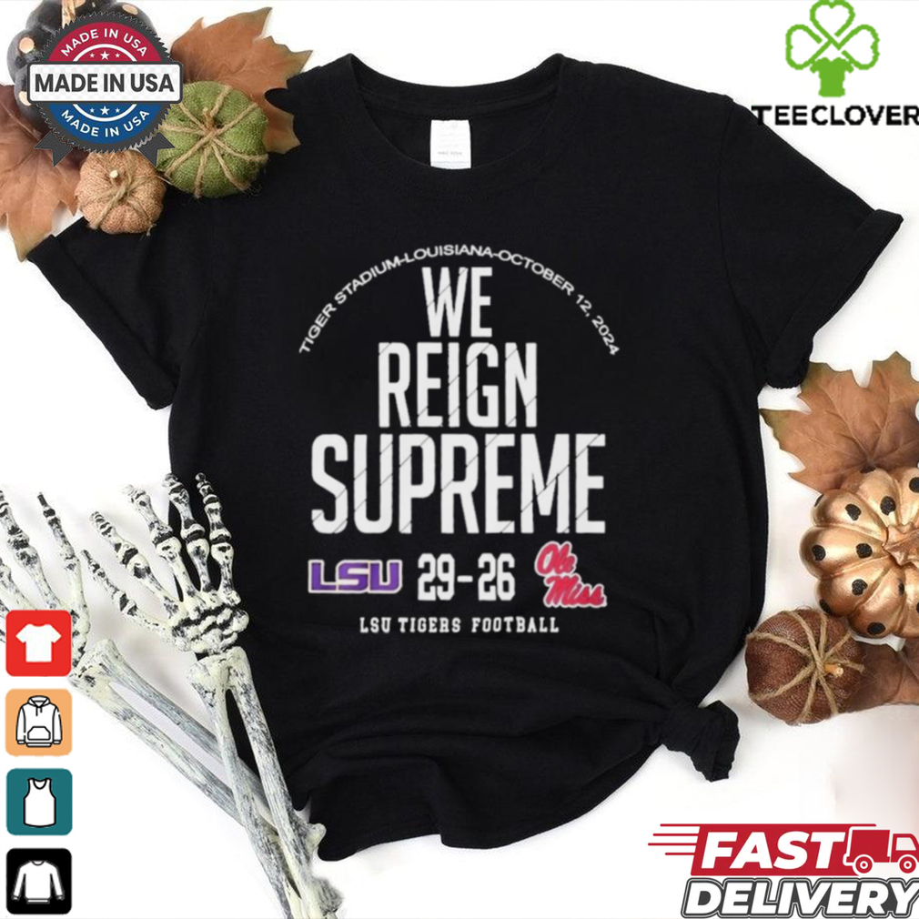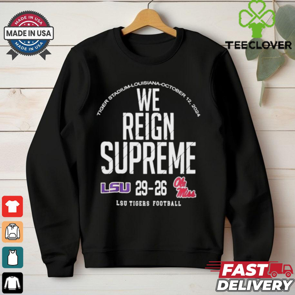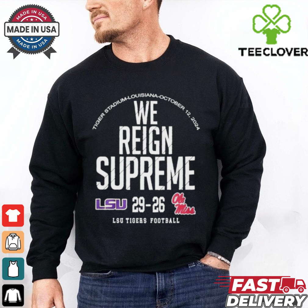 ()We Reign Supreme LSU Tigers Victory 29 26 Ole Miss Rebels Football 2024 Final Score t shirt hoodie, tank top, sweater and long sleeve t-shirt: best style for you