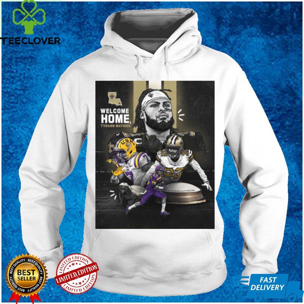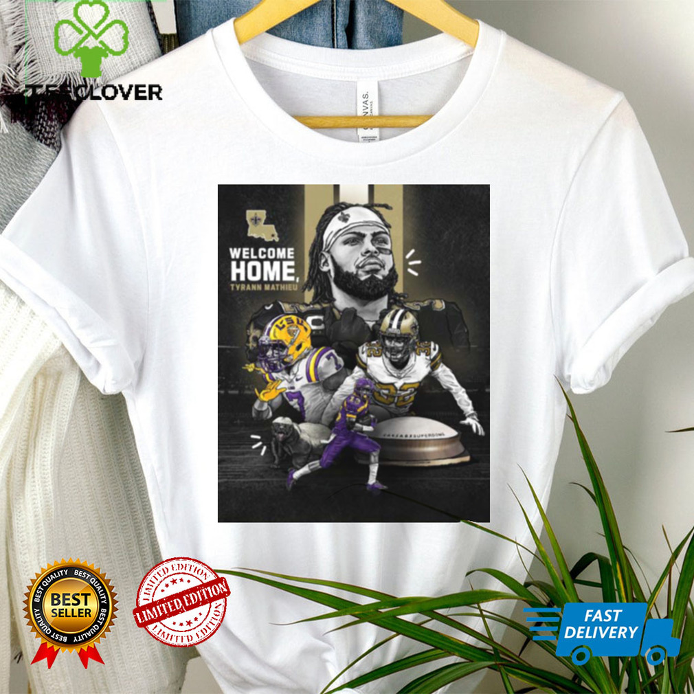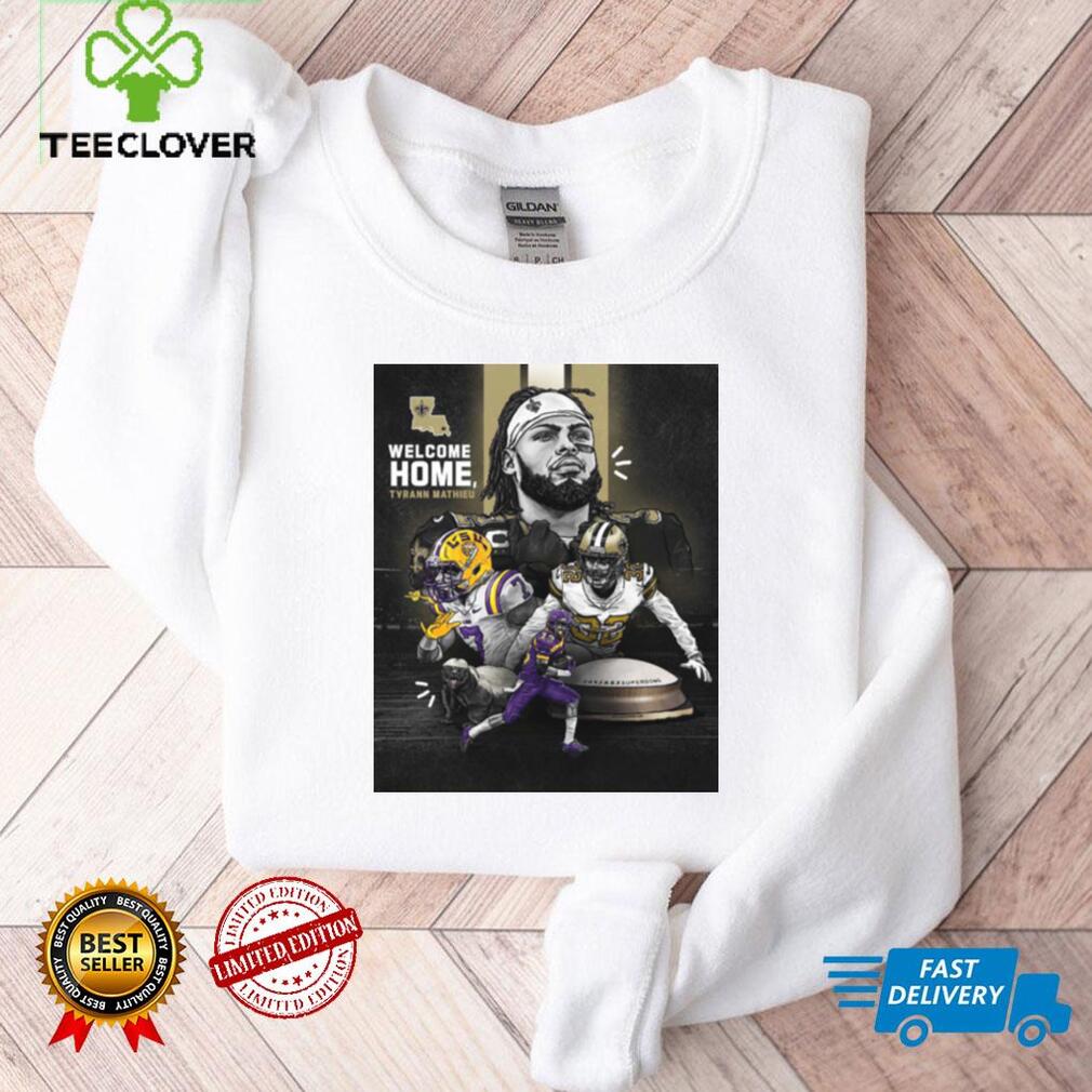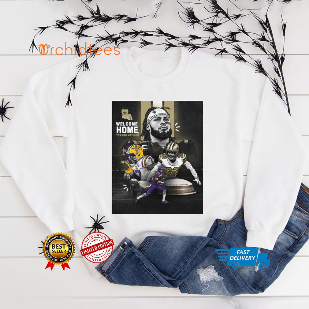 The city enjoys four distinct seasons each year. Summer is most often, quite beautiful with long evenings, gorgeous sunsets and very comfortable temperatures, fall gives us the most beautiful golden foliage to view, winter, although very cold, blesses us with scenes one would expect to see on a Christmas card. There are many opportunities to participate in winter sports, and spring. Spring brings a Welcome Home Tyrann Mathieu 32 New Orleans Saints NFL T Shirt of the horticultural side of the city. There a number of music and theatre festivals (intended to give something back to the community) which begin to show up Spring weekends. These occur from Spring right through to Fall. Edmontonians have a reputation for supporting publicly sponsored events. We host a number of international sporting events. This gives us many opportunities to volunteer our time to help. We have professional football and hockey teams.