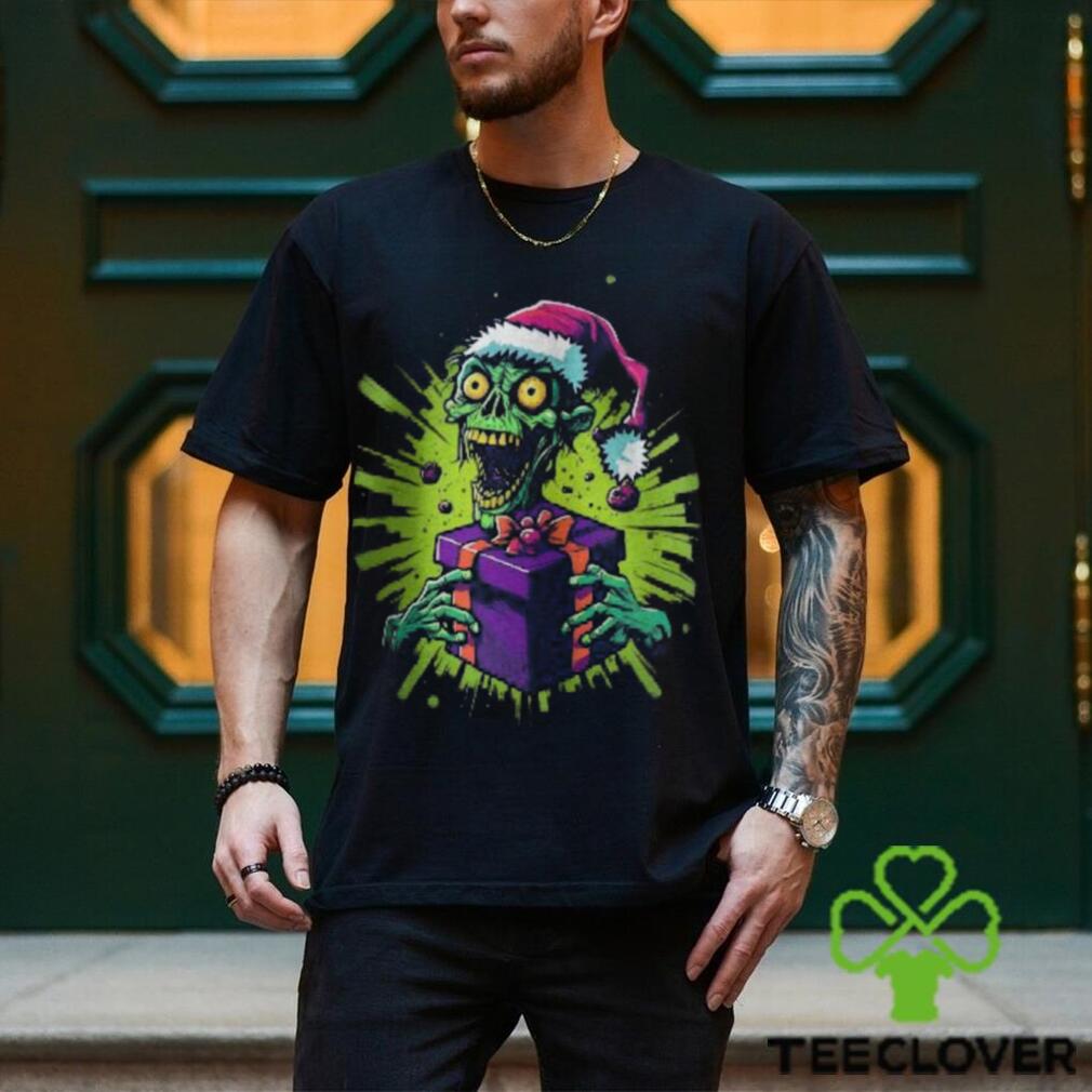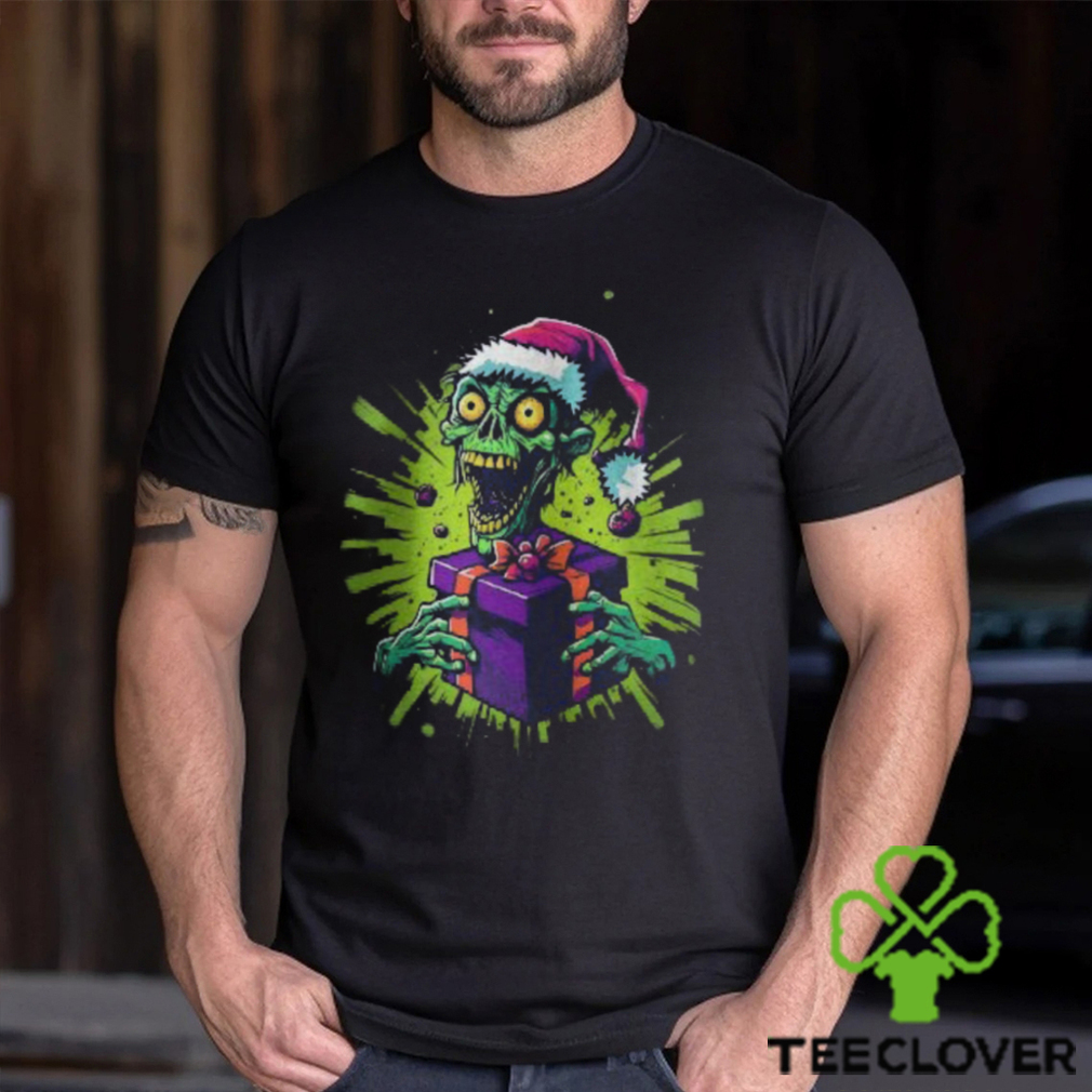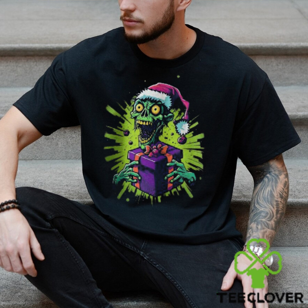 ()Zombie tenant une boîte cadeau coiffé d’un chapeau de Noël T shirt hoodie, tank top, sweater and long sleeve t-shirt